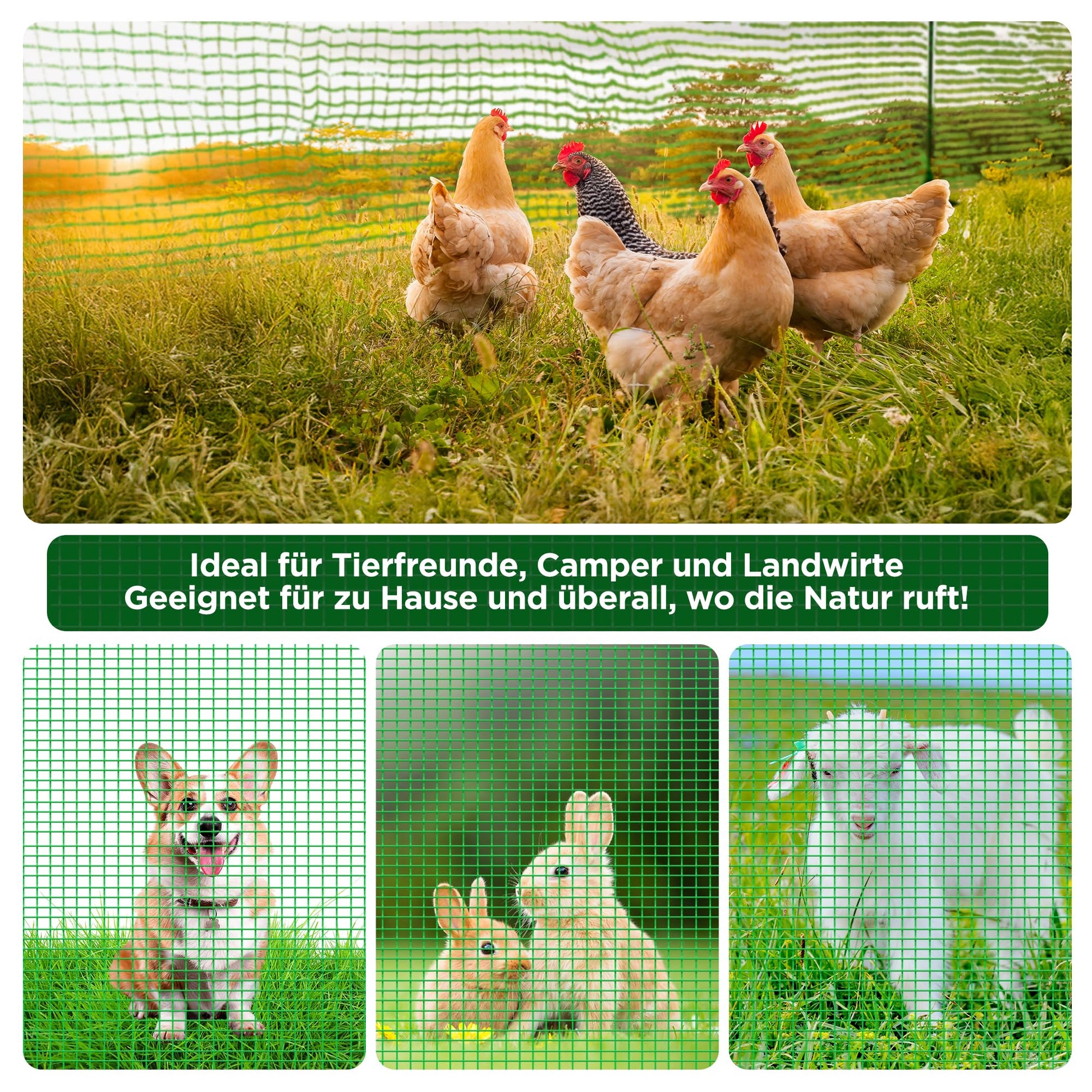 Der Zaun eignet sich hervorragend als flexible und sichere Einzäunung für Hühner, Hunde und andere Kleintiere. Die engmaschige Struktur dient als zuverlässige Barriere und schafft einen sicheren Auslauf oder schützt Ihre Gartenbeete.
