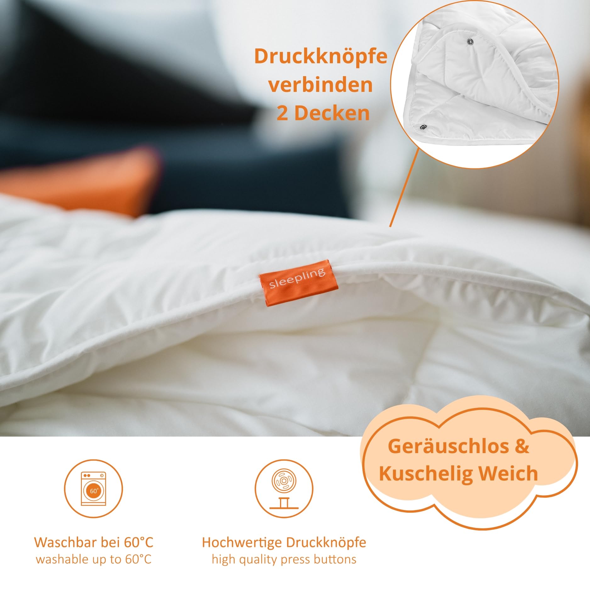 - Pflege: Die Bettdecken sind äusserst pflegeleicht, bei bis zu 60 Grad waschbar und trocknergeeignet. Für optimales Volumen nach dem Trocknen kräftig aufschütteln.