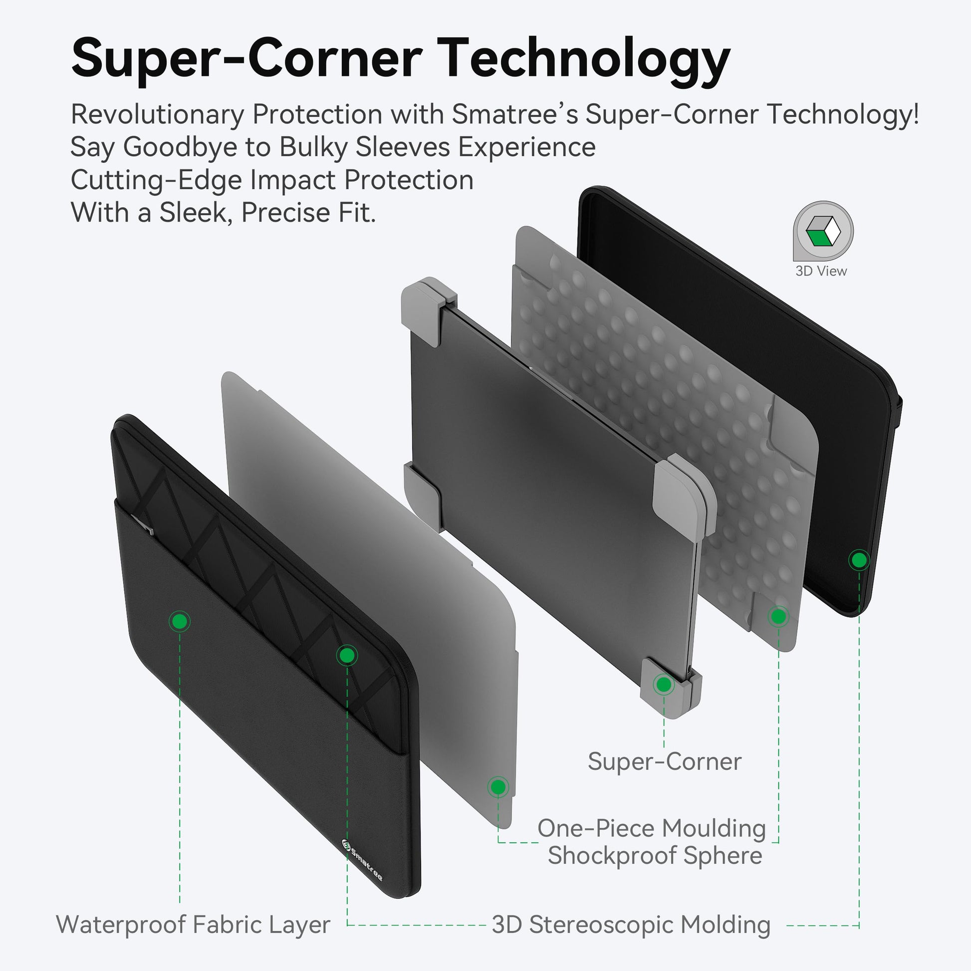 Dank der patentierten «Super Corner»-Technologie wird Ihr Notebook effektiv vor Stössen und den Folgen eines versehentlichen Fallenlassens geschützt, ohne dass die Hülle unnötig dick aufträgt. Das schlanke Design bewahrt die elegante Form Ihres Geräts und bietet dennoch erstklassige Sicherheit, wo sie am wichtigsten ist.