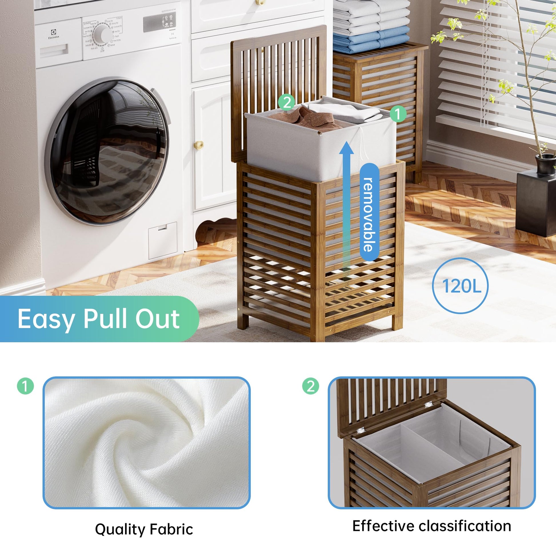 - Herausnehmbarer Wäschesack: Der Innensack aus Leinen lässt sich dank integrierter Griffe einfach herausheben und zur Waschmaschine transportieren.