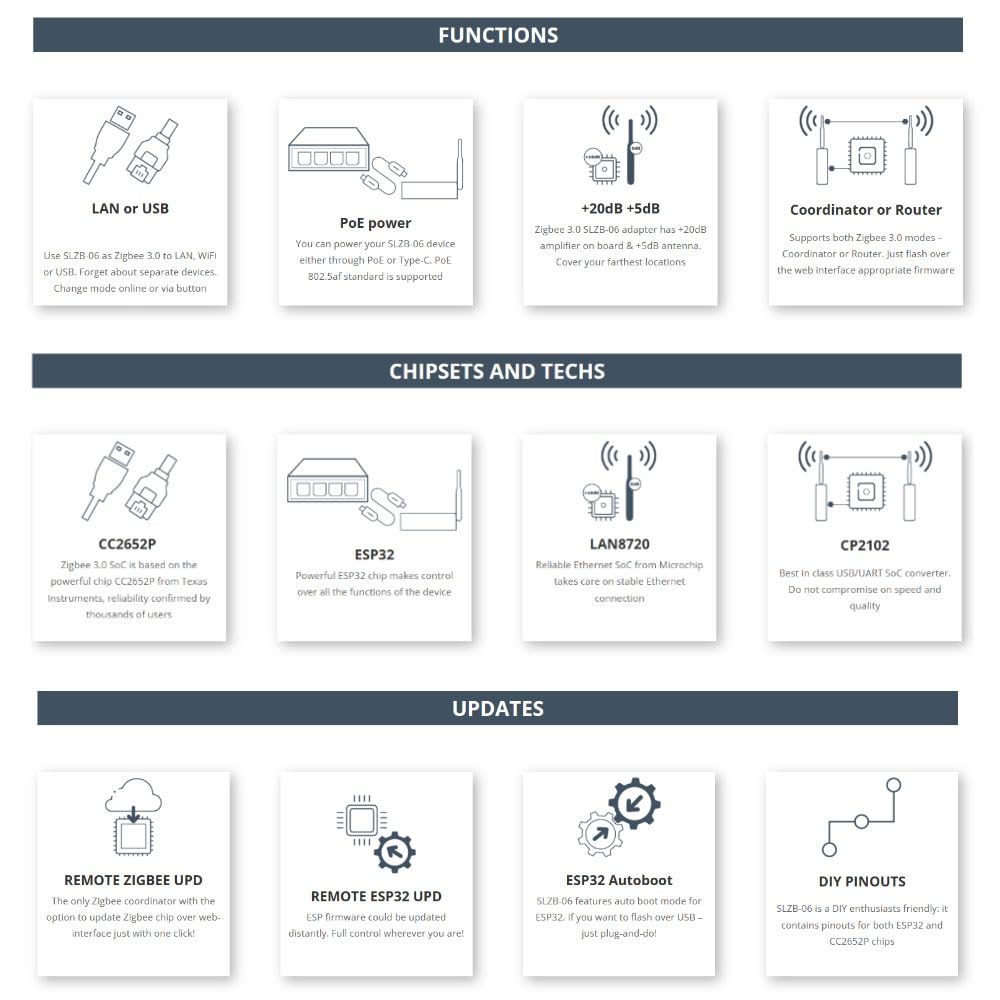 - Zigbee: Volle Unterstützung für den Zigbee 3.0 Standard. Inklusive 5 dB SMA-Antenne.