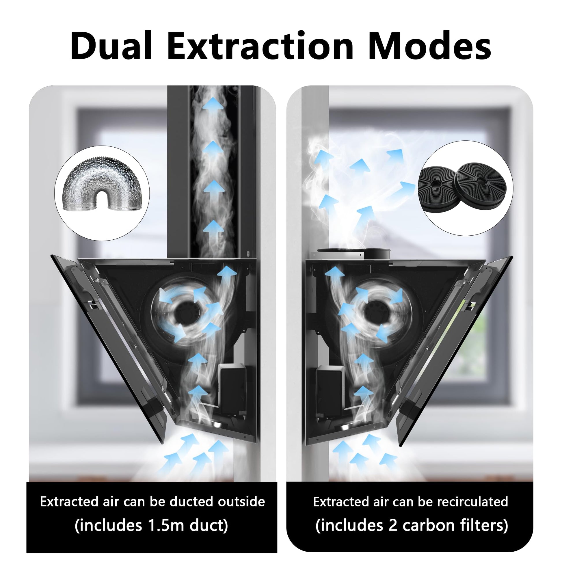 - Flexible Betriebsarten: Dank der mitgelieferten Aktivkohlefilter ist die Haube sowohl für den Abluft- als auch für den Umluftbetrieb geeignet.