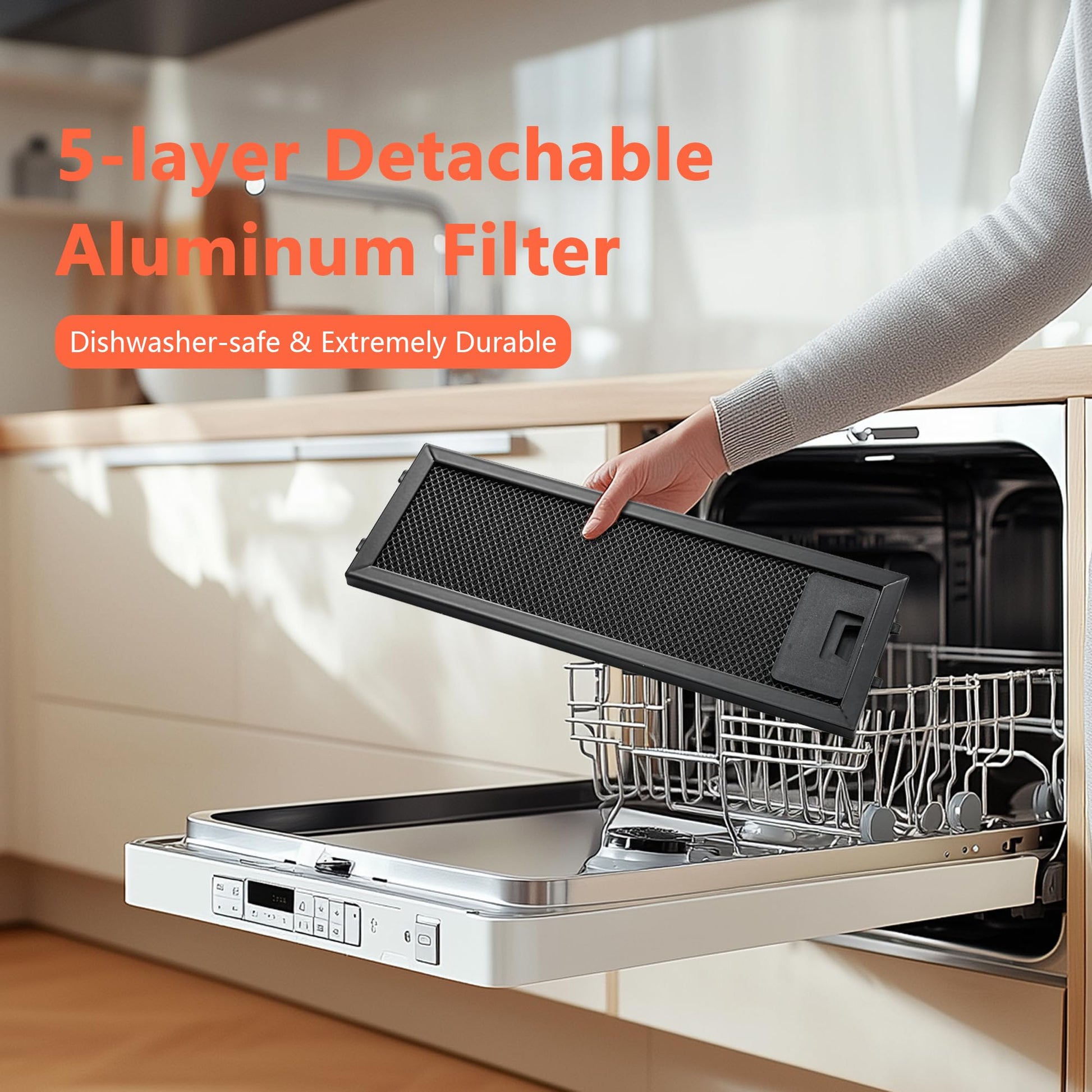 - Effiziente Fettfilterung: Der 5-lagige Aluminium-Fettfilter fängt Fettpartikel zuverlässig auf und kann einfach in der Spülmaschine gereinigt werden.