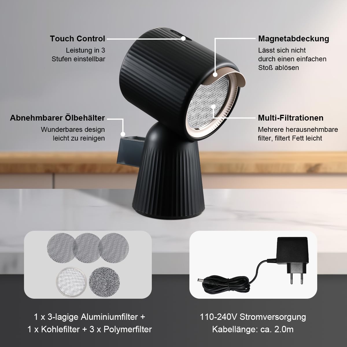 - Kompaktes und tragbares Design: Dank ihrer geringen Grösse lässt sich die Haube einfach verstauen, transportieren und direkt neben dem Kochtopf platzieren. Sie ist ideal für Kochnischen, Camping oder den Einsatz auf dem Balkon.