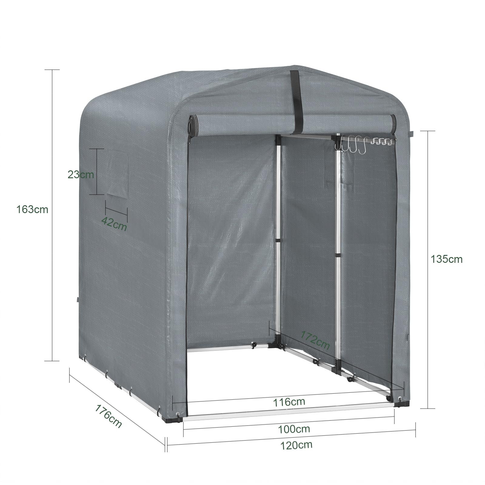 Die Konstruktion besteht aus leichten Stangen aus Aluminium und einer strapazierfähigen Plane aus PE-Material. Die genauen Produktmasse betragen 120 cm in der Breite, 163 cm in der Höhe und 176 cm in der Tiefe (B x H x T) bei einem Gewicht von ca. 8,3 kg.
