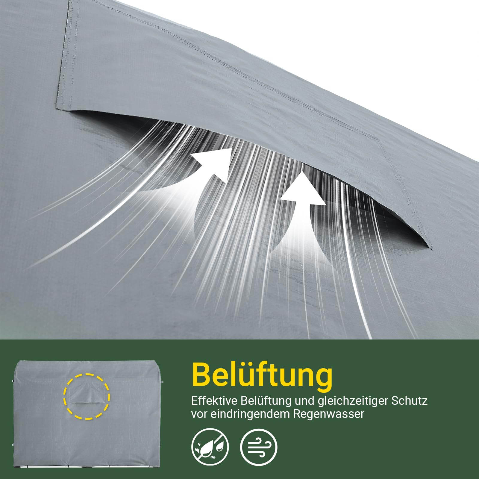 Für einen maximal sicheren Stand auch bei stärkerem Wind sorgen die mitgelieferten Zurrgurte und Sturmanker. Die Plane ist mit 13 verstärkten Ösen ausgestattet, die eine flexible und stabile Abspannung ermöglichen, egal ob im Garten, auf der Terrasse oder in der Einfahrt.