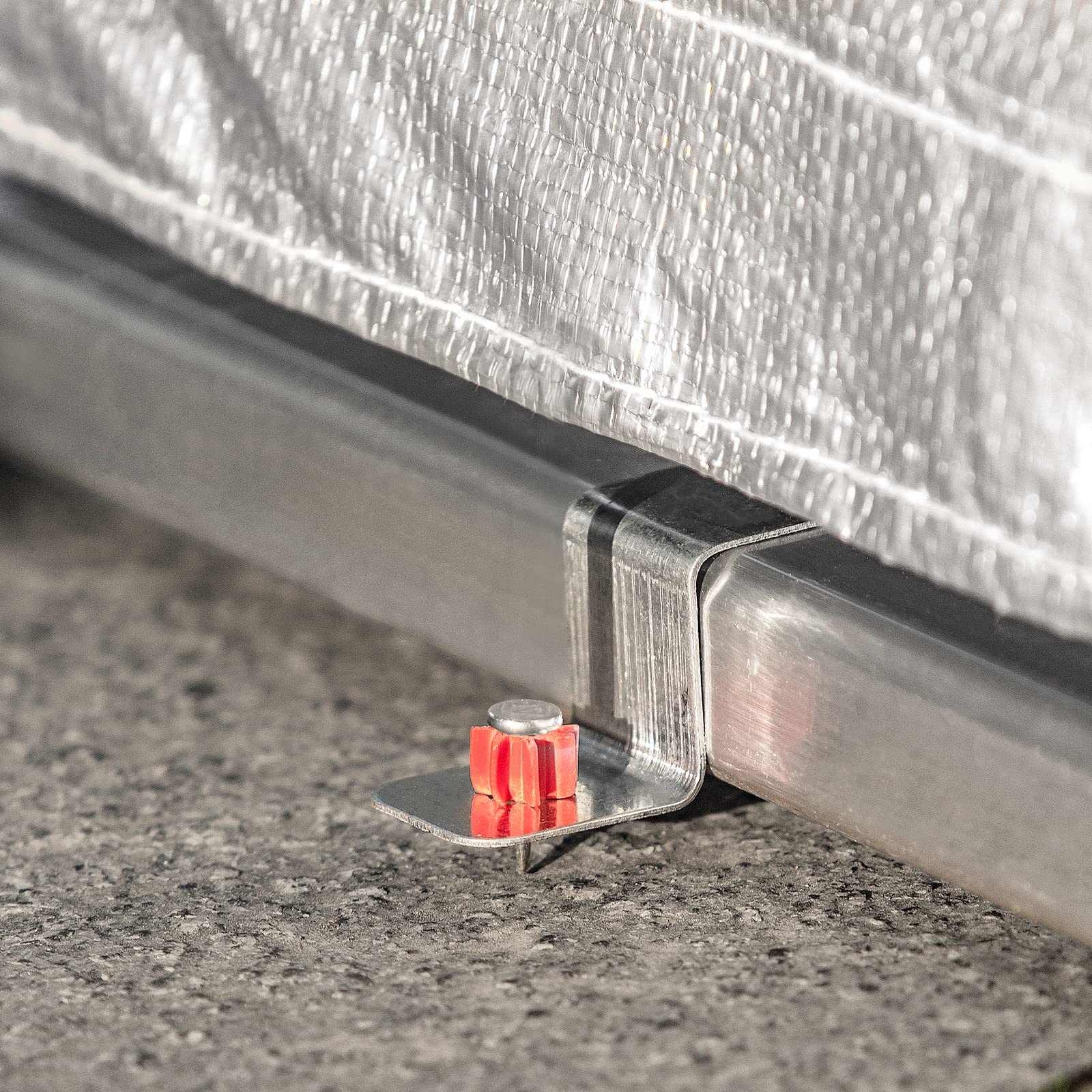 Maximale Stabilität: Für einen sicheren Stand auch bei widrigen Wetterbedingungen sorgen 13 verstärkte Ösen an der Plane sowie die mitgelieferten Zurrgurte und Sturmanker. Damit lässt sich die Garage fest im Boden verankern und gewinnt zusätzlich an Stabilität.