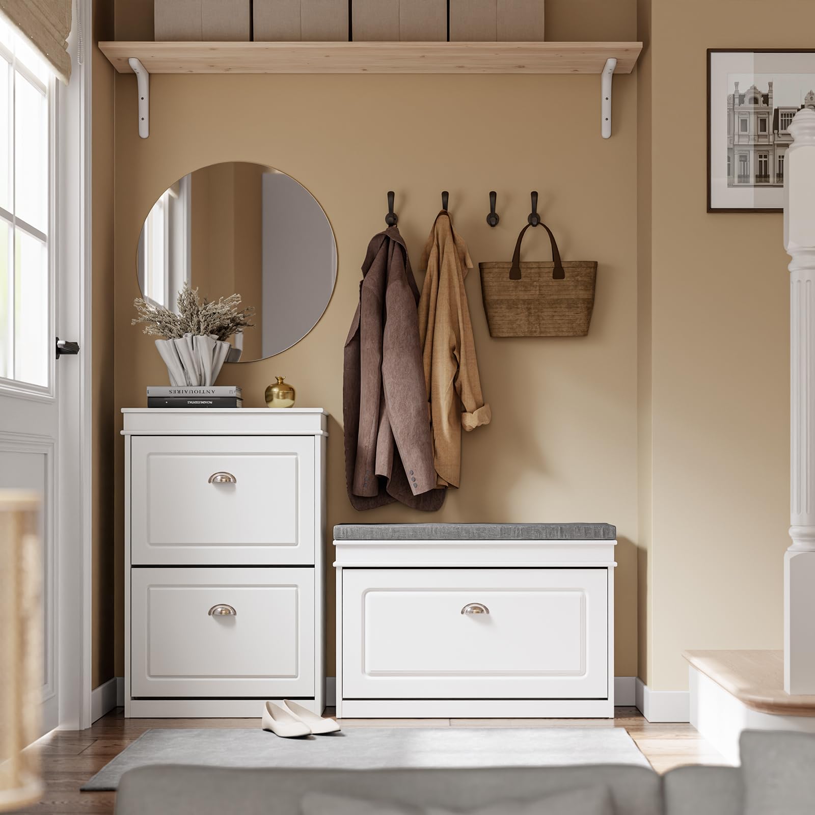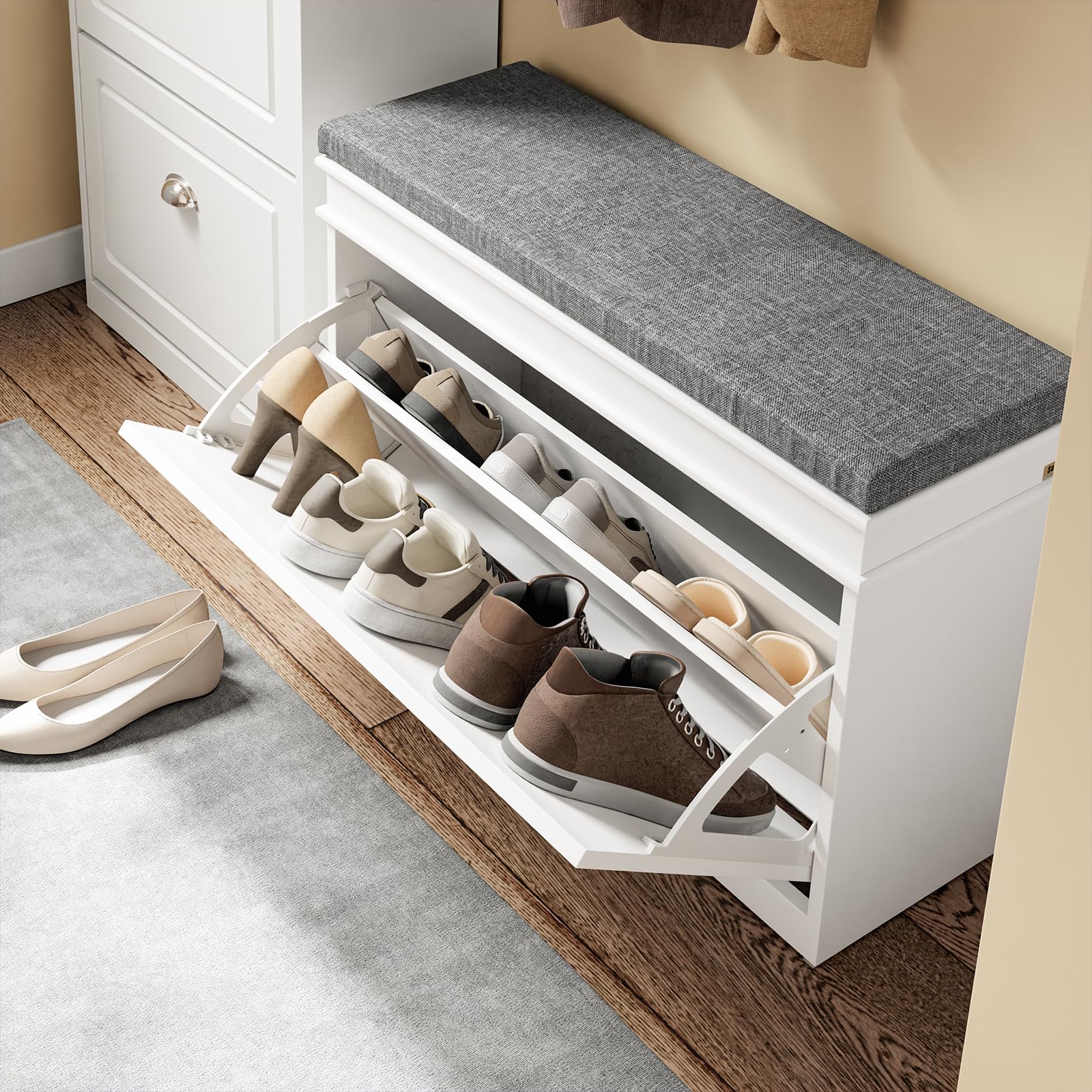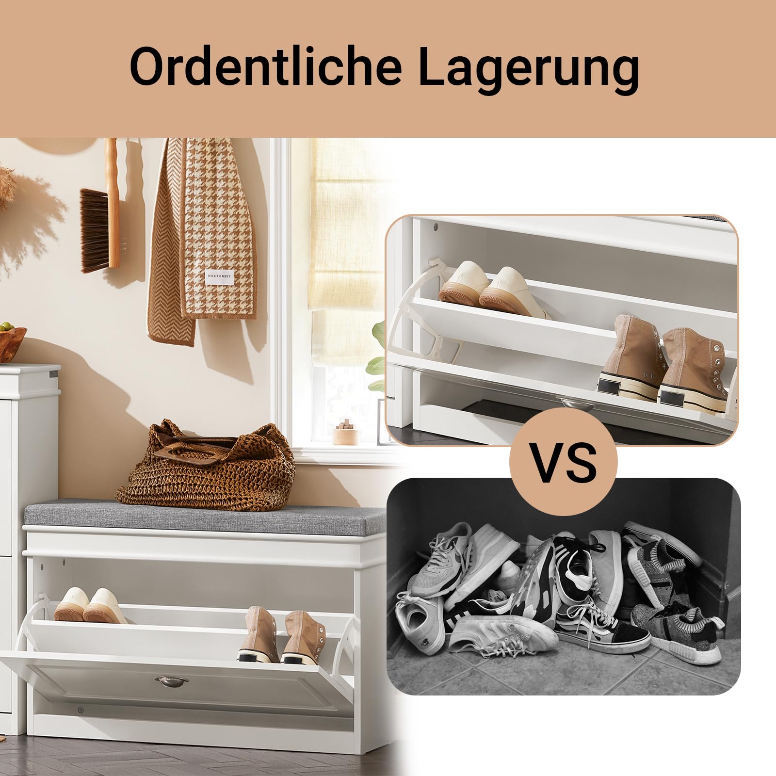 - Funktion: 2-in-1-Möbelstück mit Sitzfläche und verdecktem Schuhfach hinter einer Klappe.