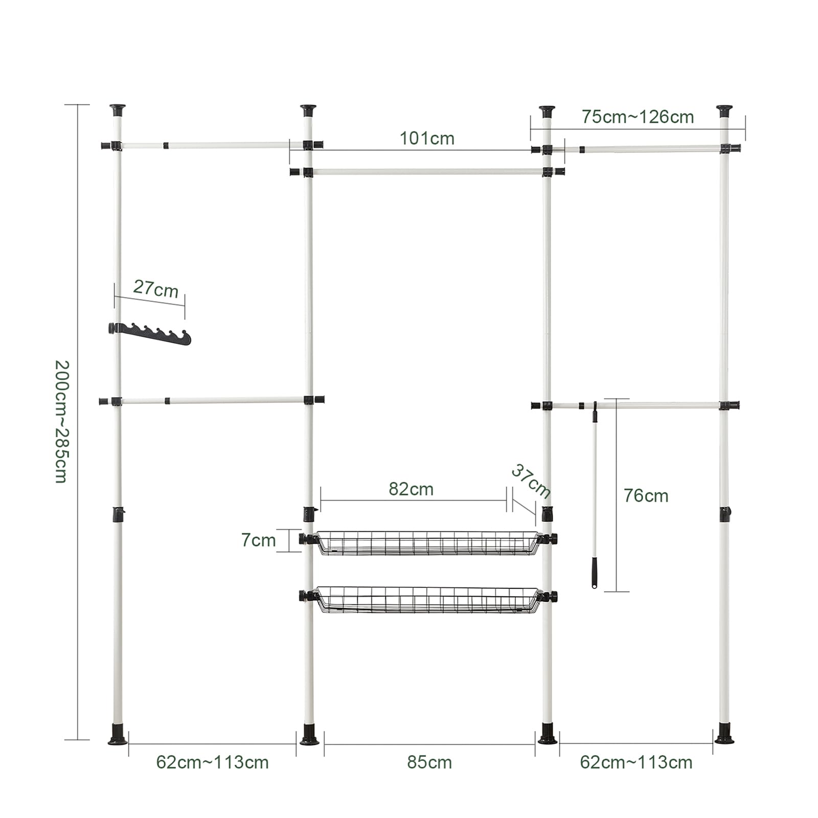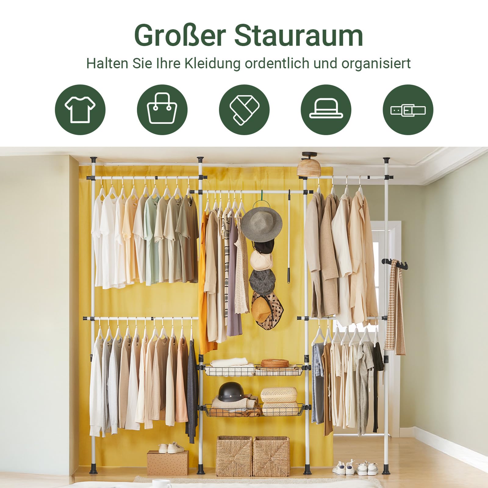 - Umfangreiche Ausstattung: Beinhaltet vier höhenverstellbare Hauptstangen, fünf Kleiderstangen (vier davon ausziehbar) sowie zwei praktische Körbe für Accessoires.