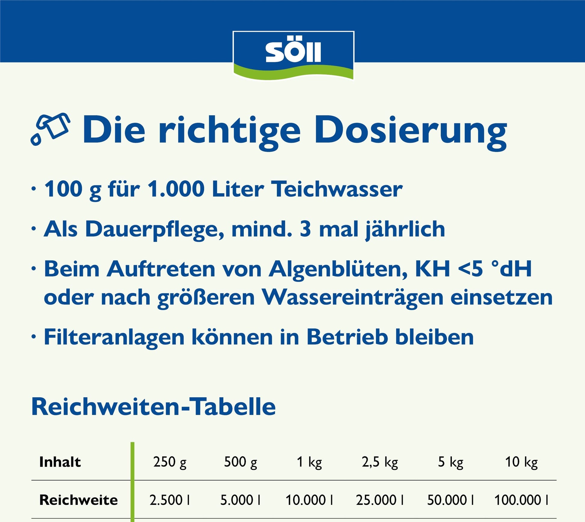 Für eine kontinuierliche Pflege streuen Sie das Mittel ab Beginn der Teichsaison regelmässig und flächig in den Teich. Eine Anwendung ist besonders nach starken Regenfällen oder beim ersten Anzeichen von Algenblüten (grünes, trübes Wasser) zu empfehlen.