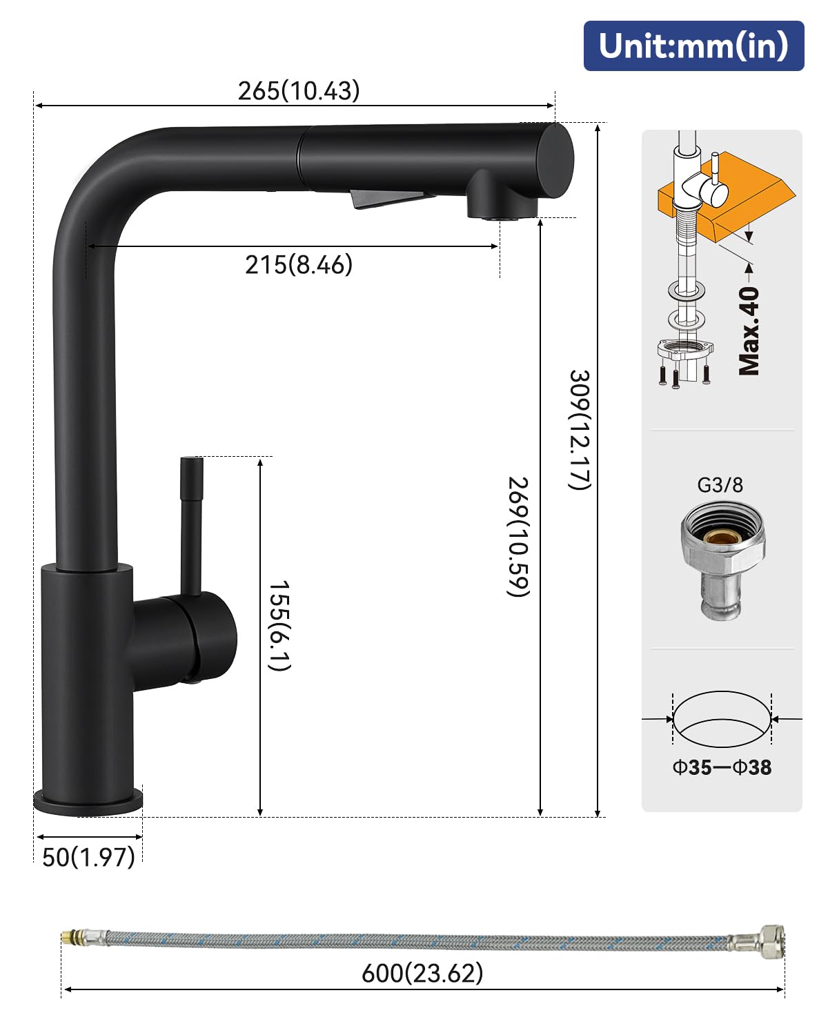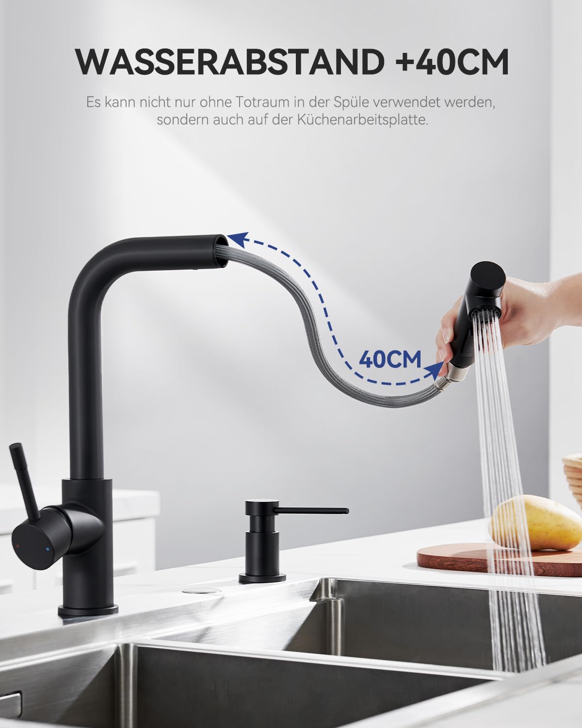 - L-förmiges Design mit ausziehbarem Brausekopf (bis zu 40 cm Reichweite)