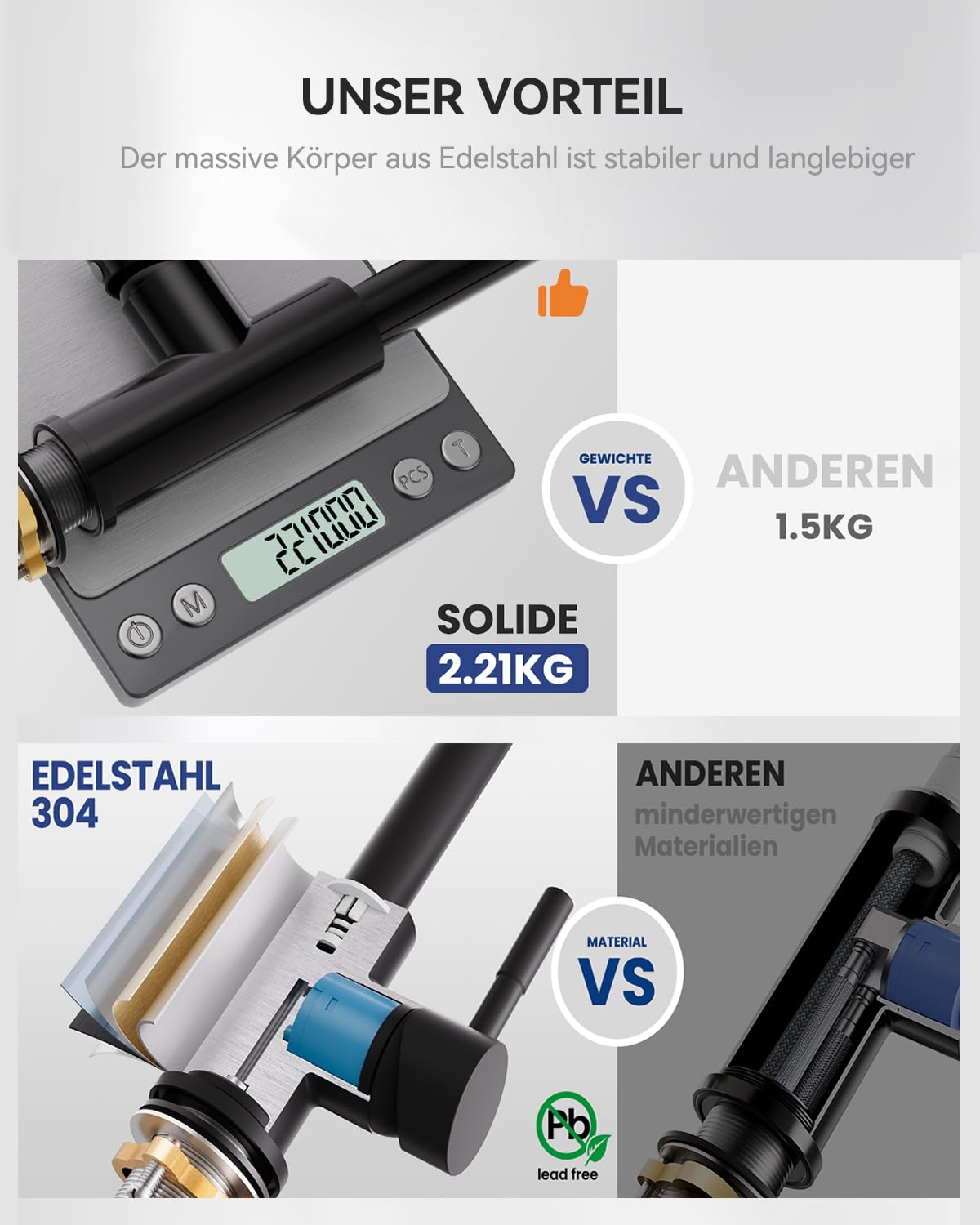 Die mattschwarze, galvanisierte Oberfläche aus hochwertigem Edelstahl 304 ist nicht nur ein modernes Design-Statement, sondern auch äusserst praktisch. Sie ist sehr pflegeleicht, robust und unempfindlich gegenüber Fingerabdrücken und Wasserflecken, wodurch Ihre Küche länger sauber und elegant aussieht.