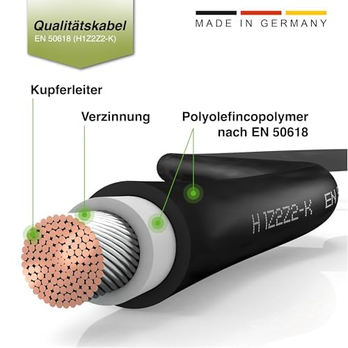 Ein 6mm² Querschnitt ist ideal für die meisten privaten und gewerblichen Photovoltaikanlagen. Er minimiert Leistungsverluste (Spannungsabfall) über längere Distanzen, wie die hier angebotenen 50 Meter, und ist für höhere Stromstärken ausgelegt, die bei der Reihen- oder Parallelschaltung mehrerer Module entstehen. Dies sorgt für maximale Effizienz und Sicherheit Ihrer Anlage.