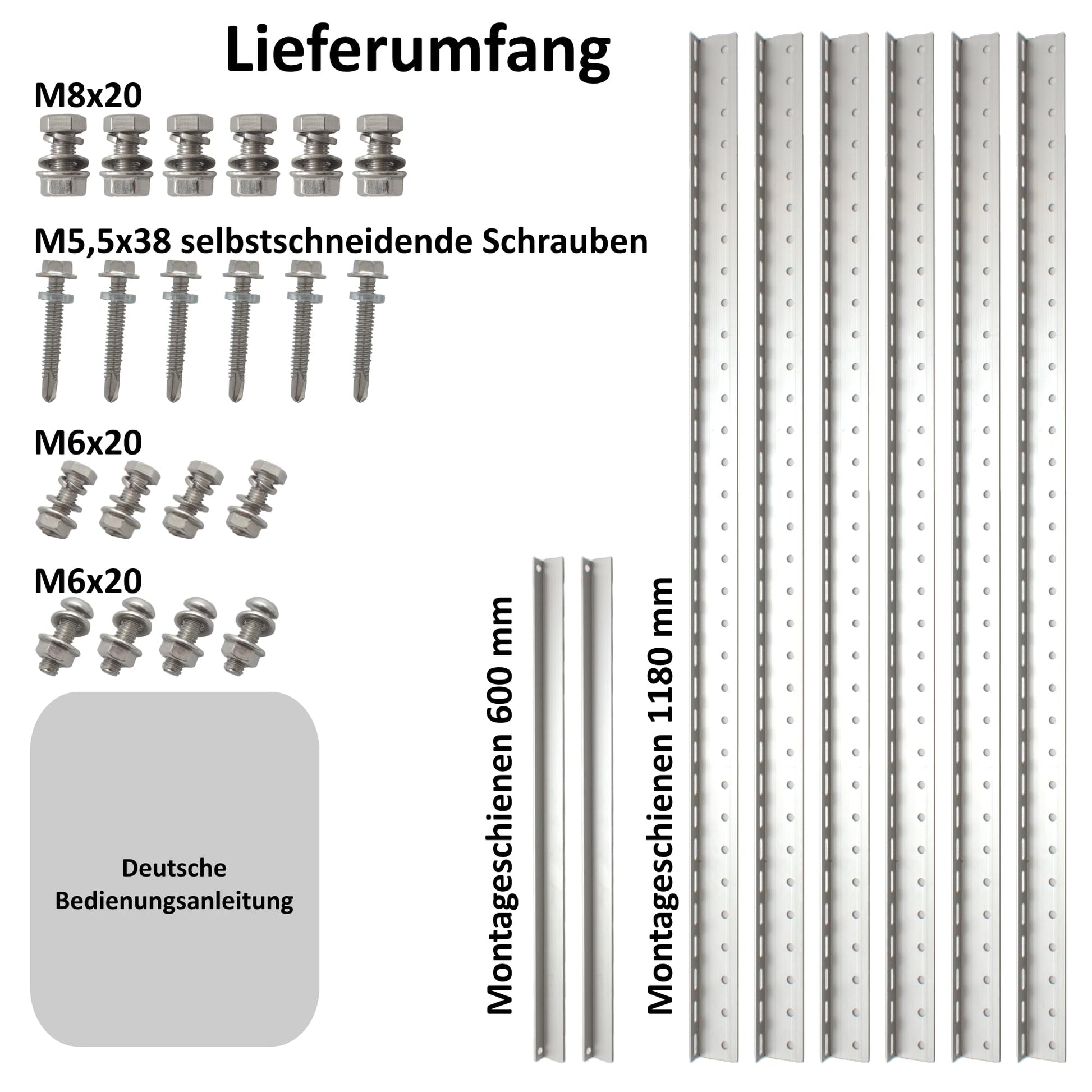 - Kompatibilität: Extralange 118-cm-Schienen eignen sich hervorragend für grosse und leistungsstarke Solarmodule von 400 bis 600 Watt, sowohl bei horizontaler als auch vertikaler Montage.