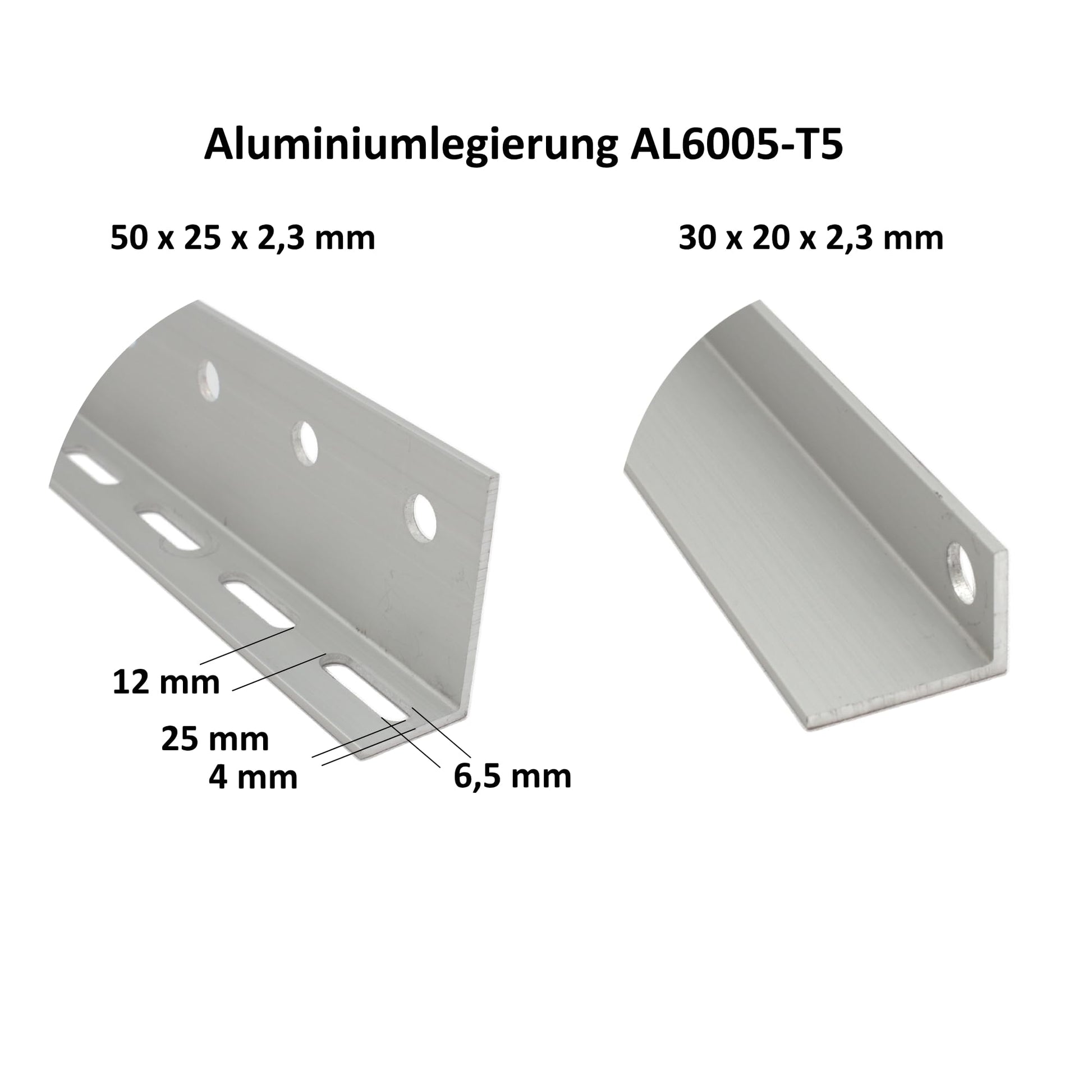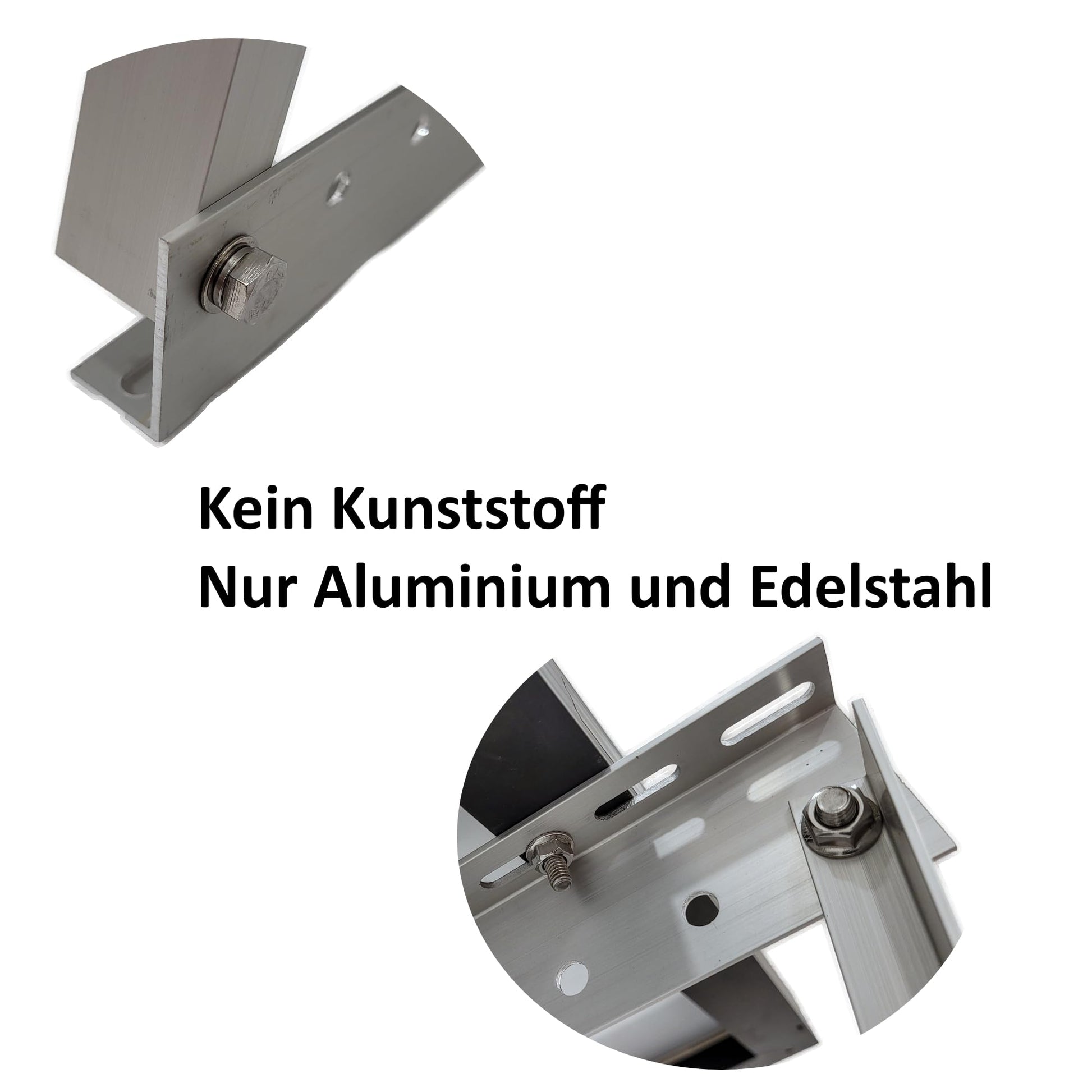 Die Halterung ist für maximale Langlebigkeit gefertigt. Sie besteht aus einer hochfesten 6005-T5 Aluminiumlegierung mit Befestigungsmaterial aus rostfreiem Edelstahl. Im Gegensatz zu Kunststofflösungen ist sie absolut UV-beständig, korrosionsfest und widersteht jeder Witterung.