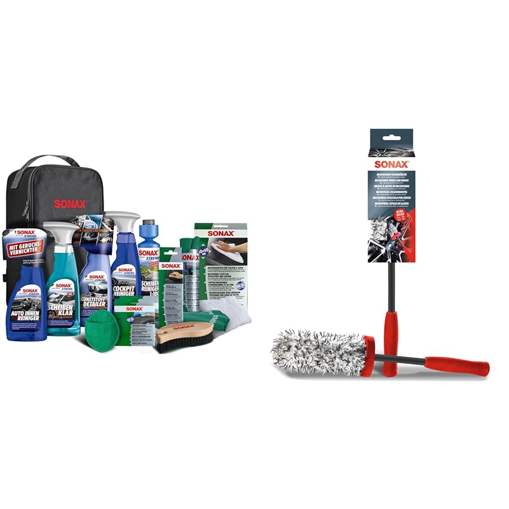 Mit diesem umfassenden Set von SONAX bringen Sie nicht nur den Innenraum Ihres Fahrzeugs, sondern auch Ihre Felgen auf Hochglanz. Es kombiniert ein 11-teiliges Pflegeset für Interieur und Scheiben mit einer spezialisierten Microfaser-Bürste für eine komplette und schonende Fahrzeugaufbereitung.
