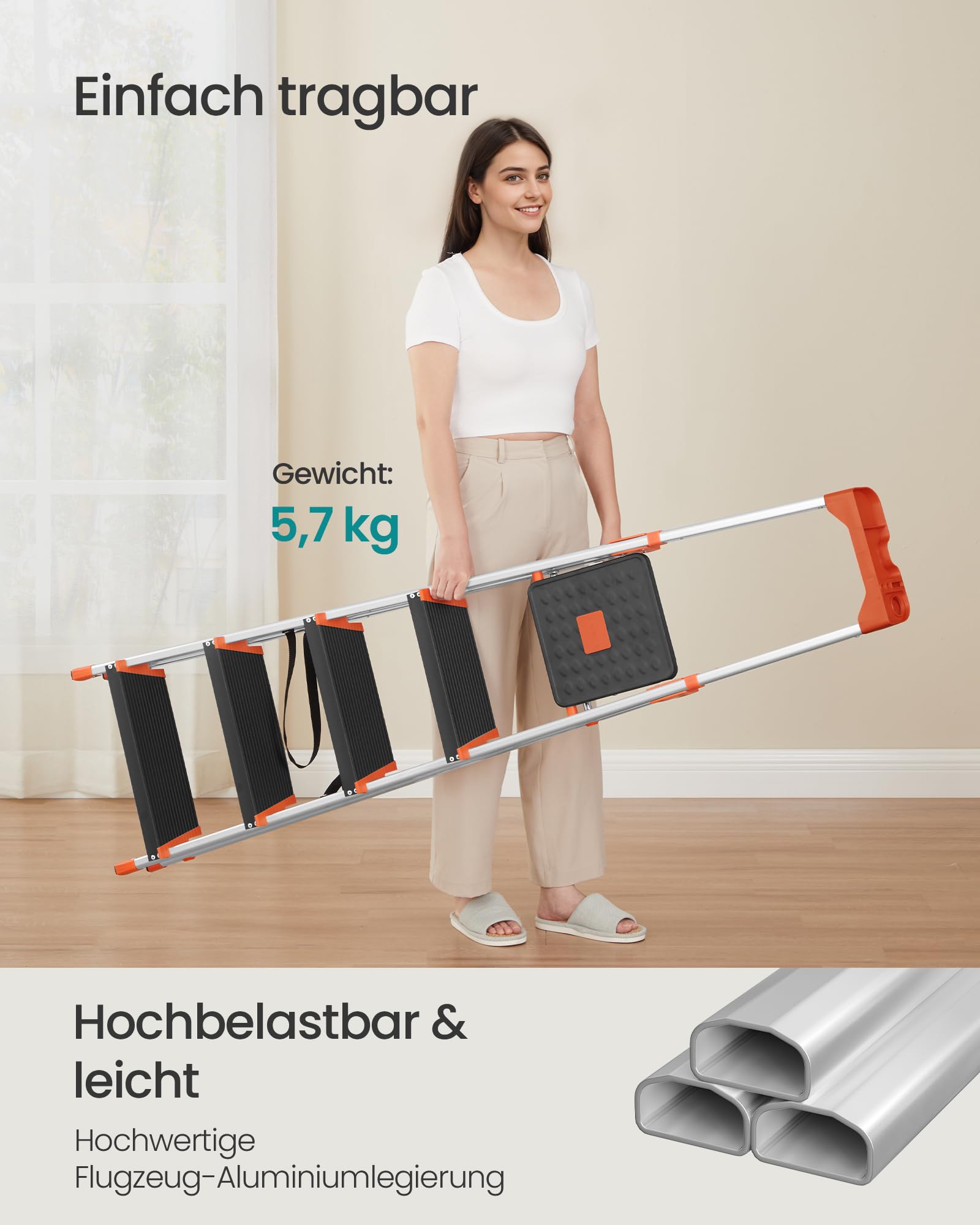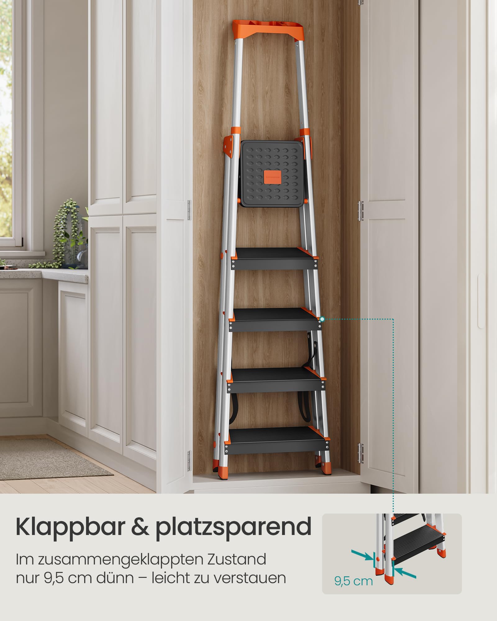 - Leicht und kompakt: Dank des Aluminiumgestells wiegt die Leiter nur 5,7 kg. Zusammengeklappt ist sie mit 9,5 cm extrem flach und lässt sich platzsparend in jeder Nische verstauen.