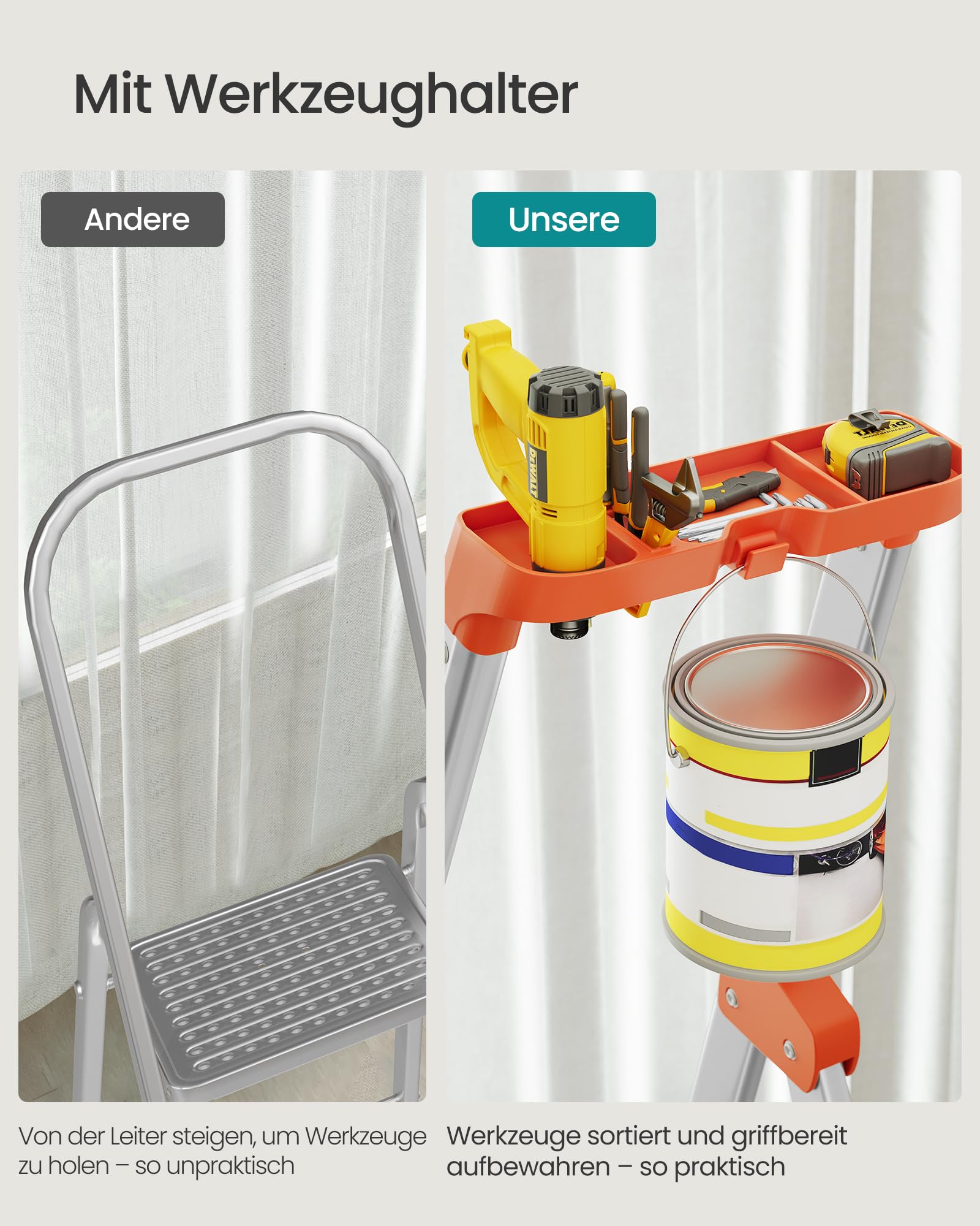 - Integrierte Werkzeugablage: Im oberen Handlauf befindet sich eine praktische Schale, damit Schrauben, Dübel und andere Kleinteile während der Arbeit stets griffbereit sind.