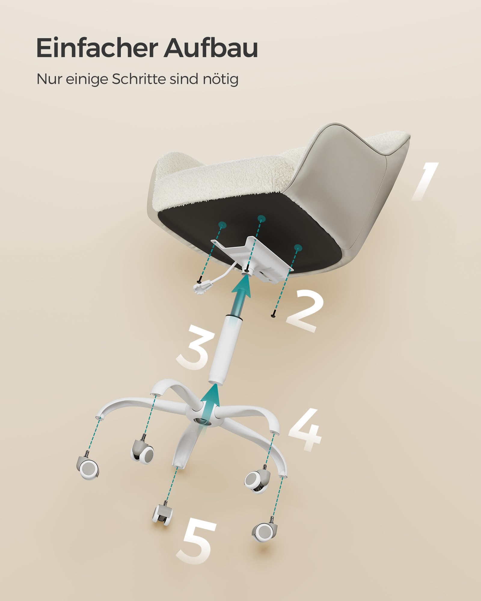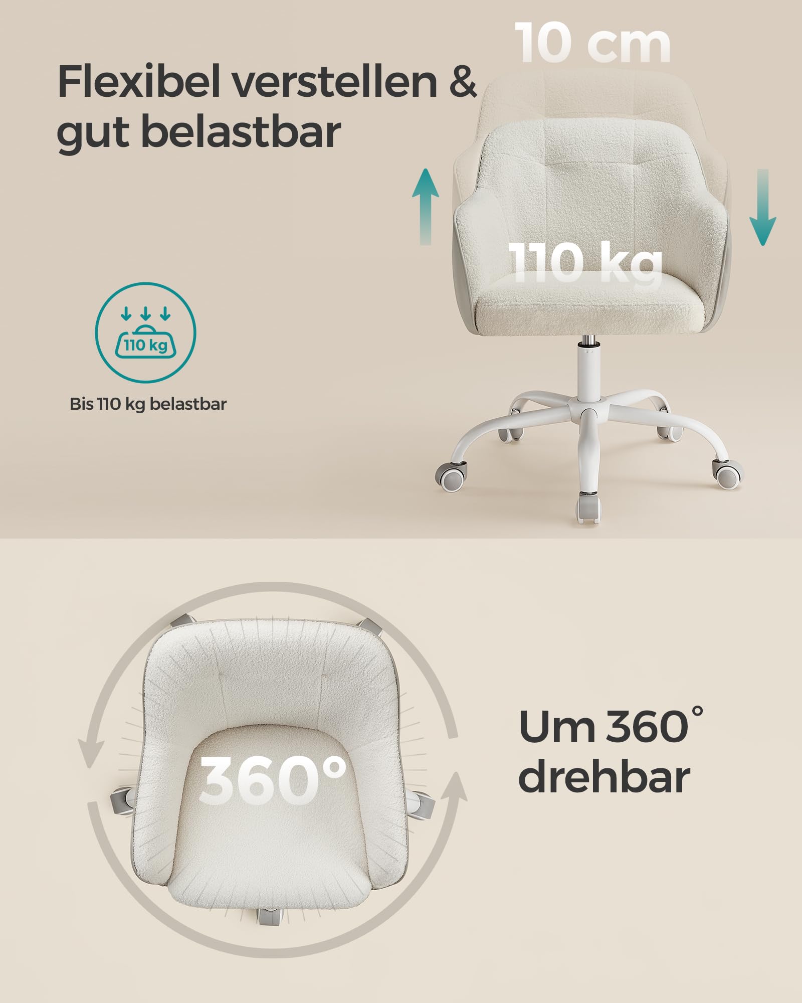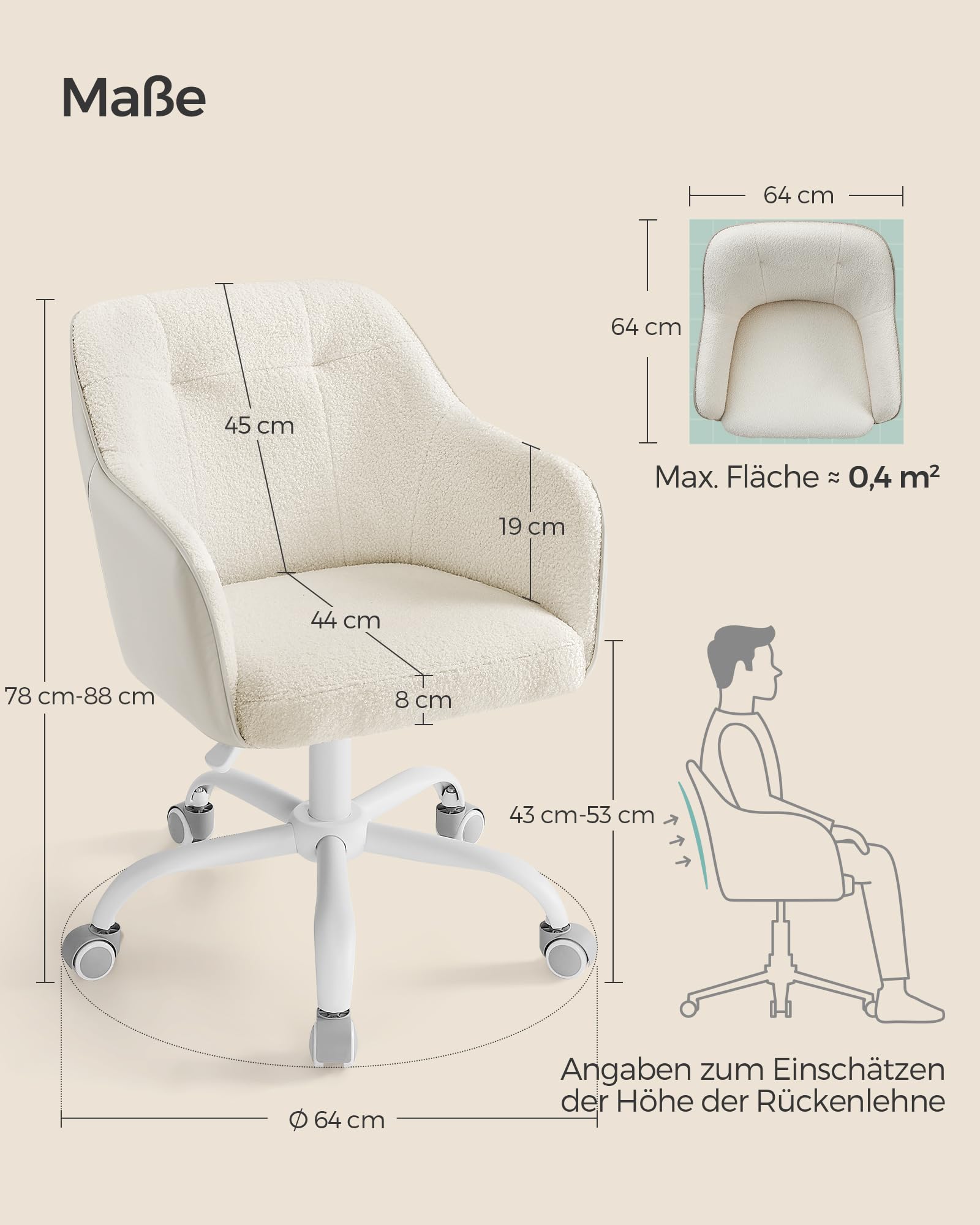 Der hohe Sitzkomfort wird durch eine grosszügige Schaumstoffpolsterung und die ergonomisch geformte Sitzschale gewährleistet. Rücken und Arme werden optimal gestützt, was ein ermüdungsfreies Arbeiten über längere Zeit ermöglicht. Der weiche Sherpa-Stoffbezug sorgt zusätzlich für ein behagliches Sitzgefühl.