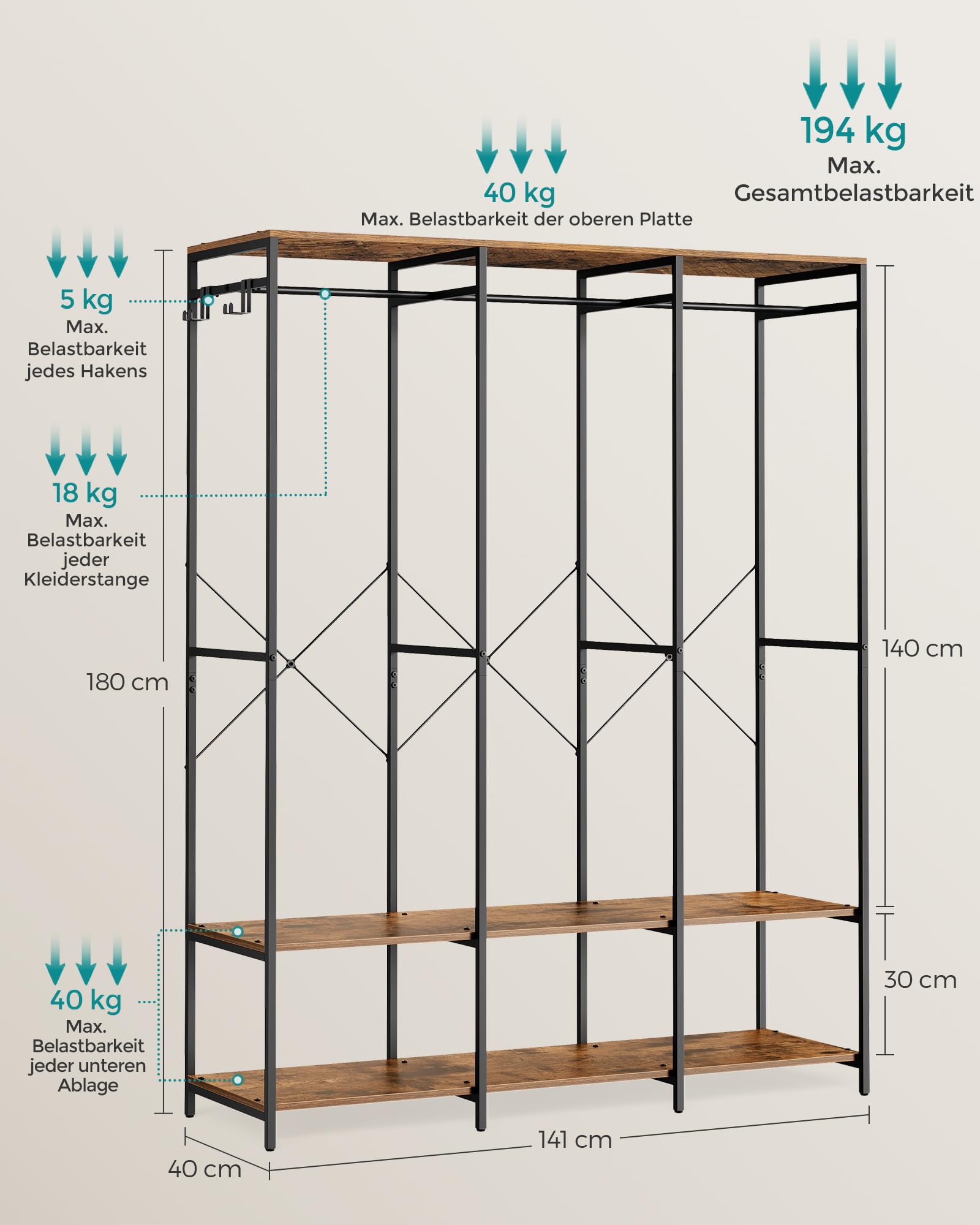 Er verfügt über eine 141 cm breite Kleiderstange, eine obere Ablage für Hüte oder Boxen, mehrere untere Regalböden für Schuhe oder gefaltete Kleidung sowie praktische, abnehmbare Haken an der Seite für Taschen, Schals oder Accessoires.