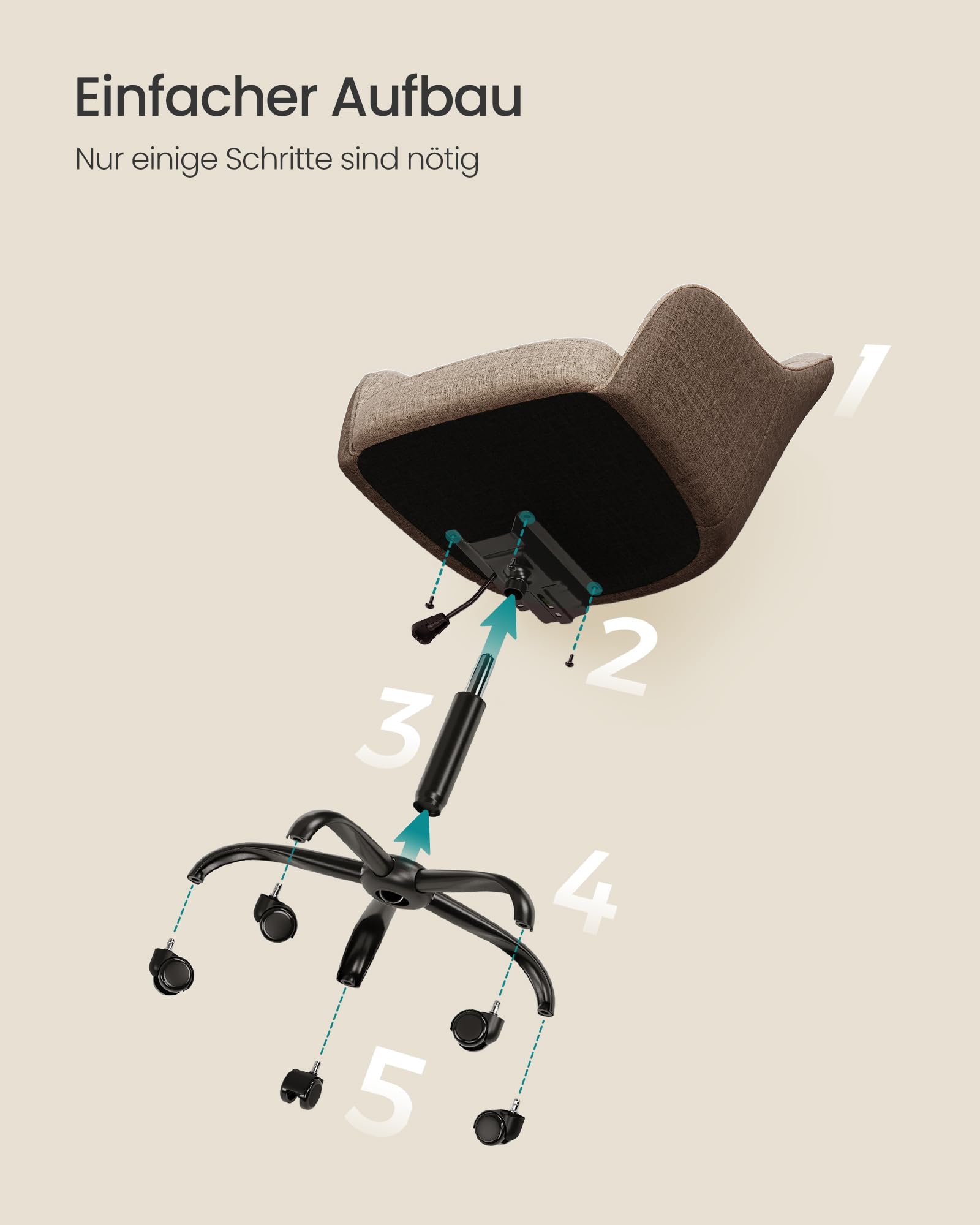 Die Montage ist bewusst unkompliziert und rasch gestaltet. Dank der klaren Anleitung und der mitgelieferten Teile lässt sich der Stuhl in wenigen einfachen Schritten schnell und ohne zusätzliches Werkzeug aufbauen.