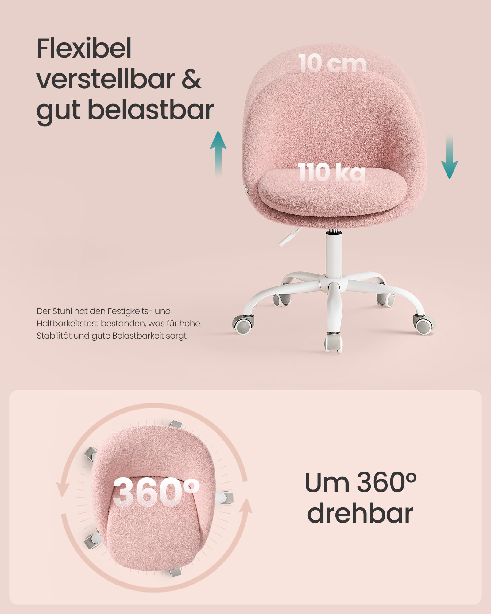 Verleihen Sie Ihrem Arbeits- oder Schminkbereich mit diesem eleganten Drehstuhl in zartem Pastellrosa einen Hauch von Stil und Komfort. Seine klaren, geometrischen Linien und der weiche Fleece-Bezug machen ihn zu einem vielseitigen Möbelstück für jedes moderne Zuhause.