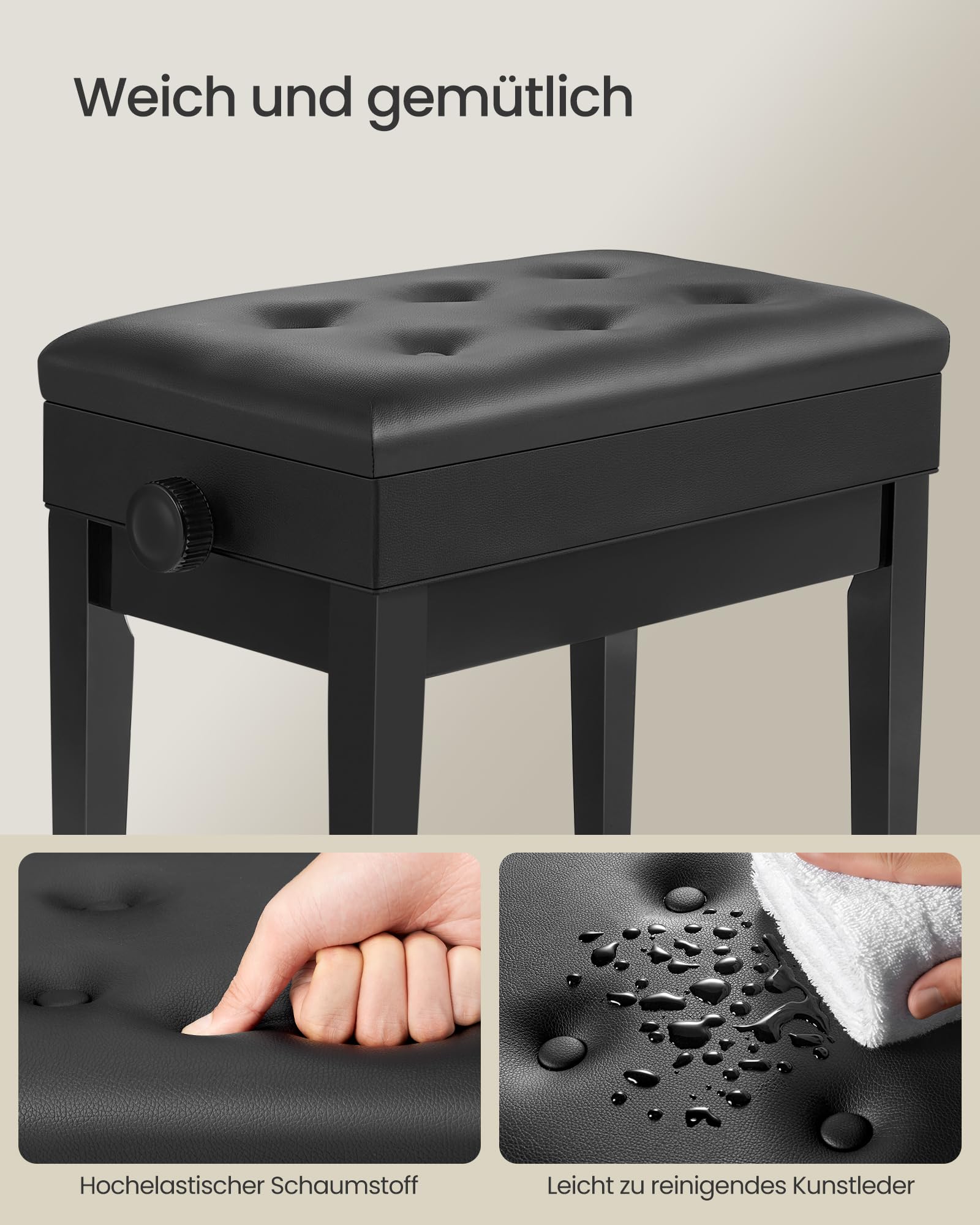- Integrierter Stauraum: Verstecktes Fach unter der Sitzfläche für Noten und Bücher.