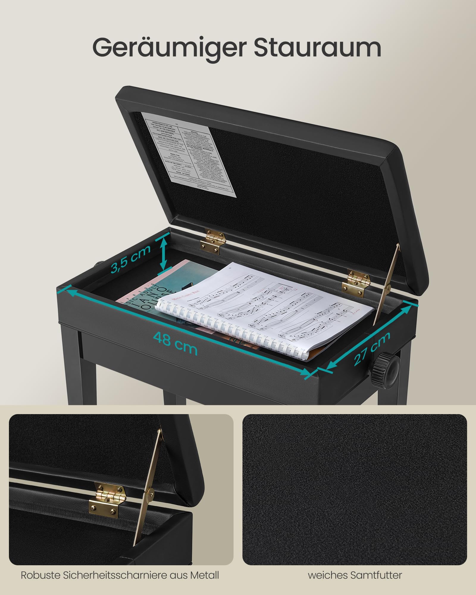 Ordnung leicht gemacht: Das grosszügige Staufach unter der Sitzfläche bietet ausreichend Platz, um Ihre Notenblätter und Bücher staubfrei und stets griffbereit aufzubewahren. Die soliden Metallscharniere halten den Deckel sicher offen, sodass Sie bequem auf den Inhalt zugreifen können.