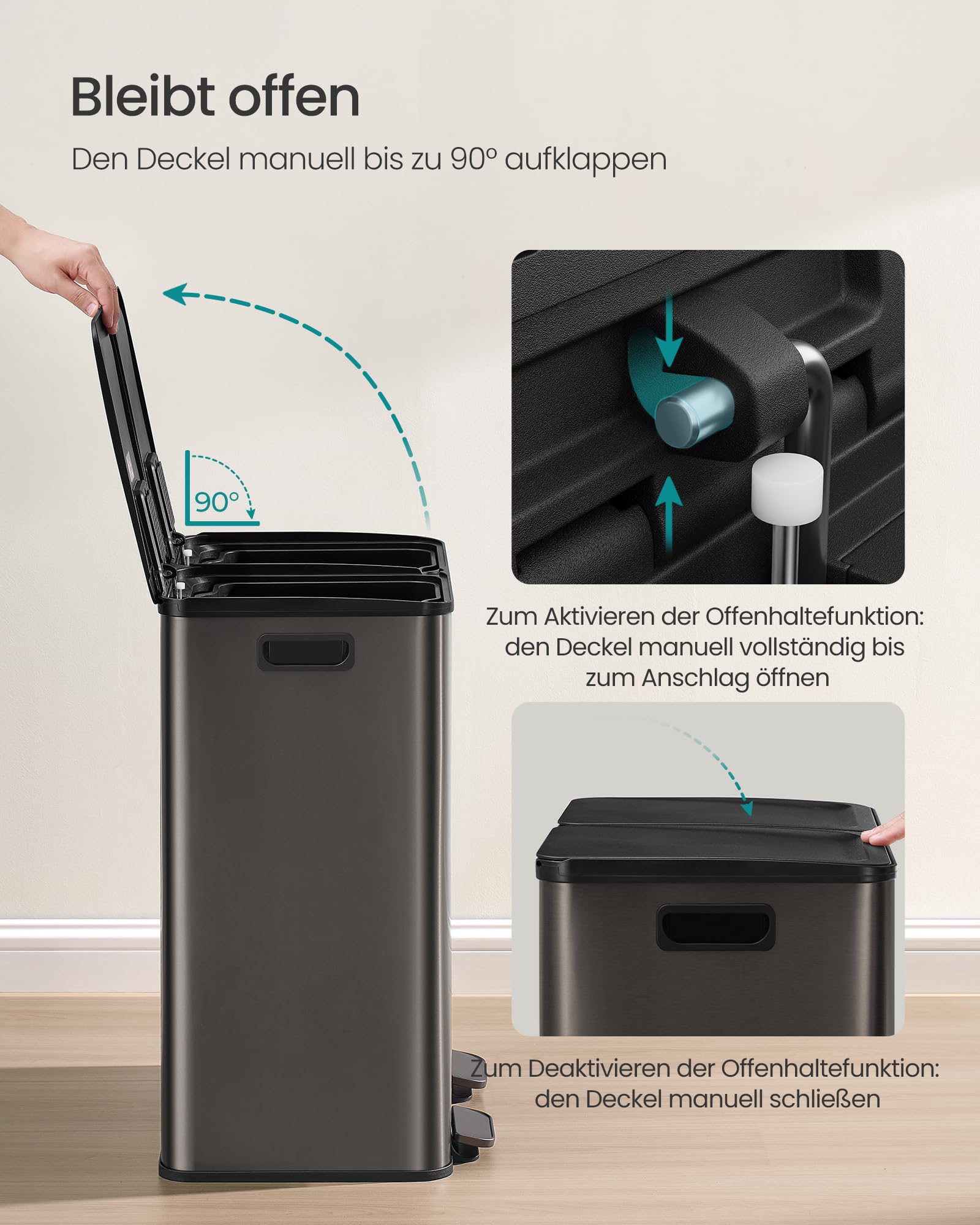 - Praktische Inneneimer: Zwei herausnehmbare Inneneimer aus Kunststoff erleichtern das Entleeren und die Reinigung.