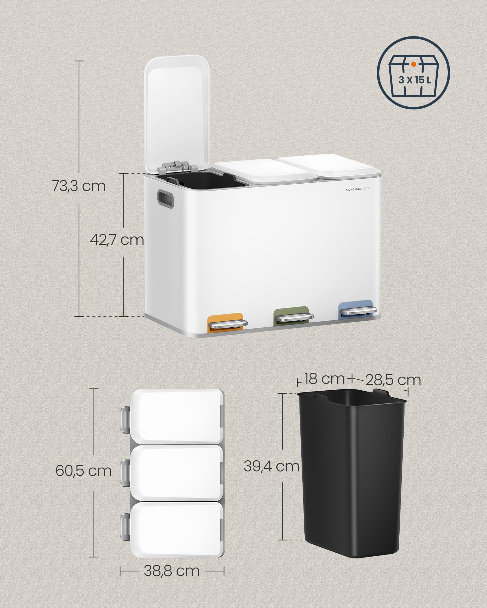 - Drei Fächer: Ausgestattet mit drei separaten 15-Liter-Inneneimern für eine einfache Trennung von Wertstoffen, Biomüll und Restmüll.