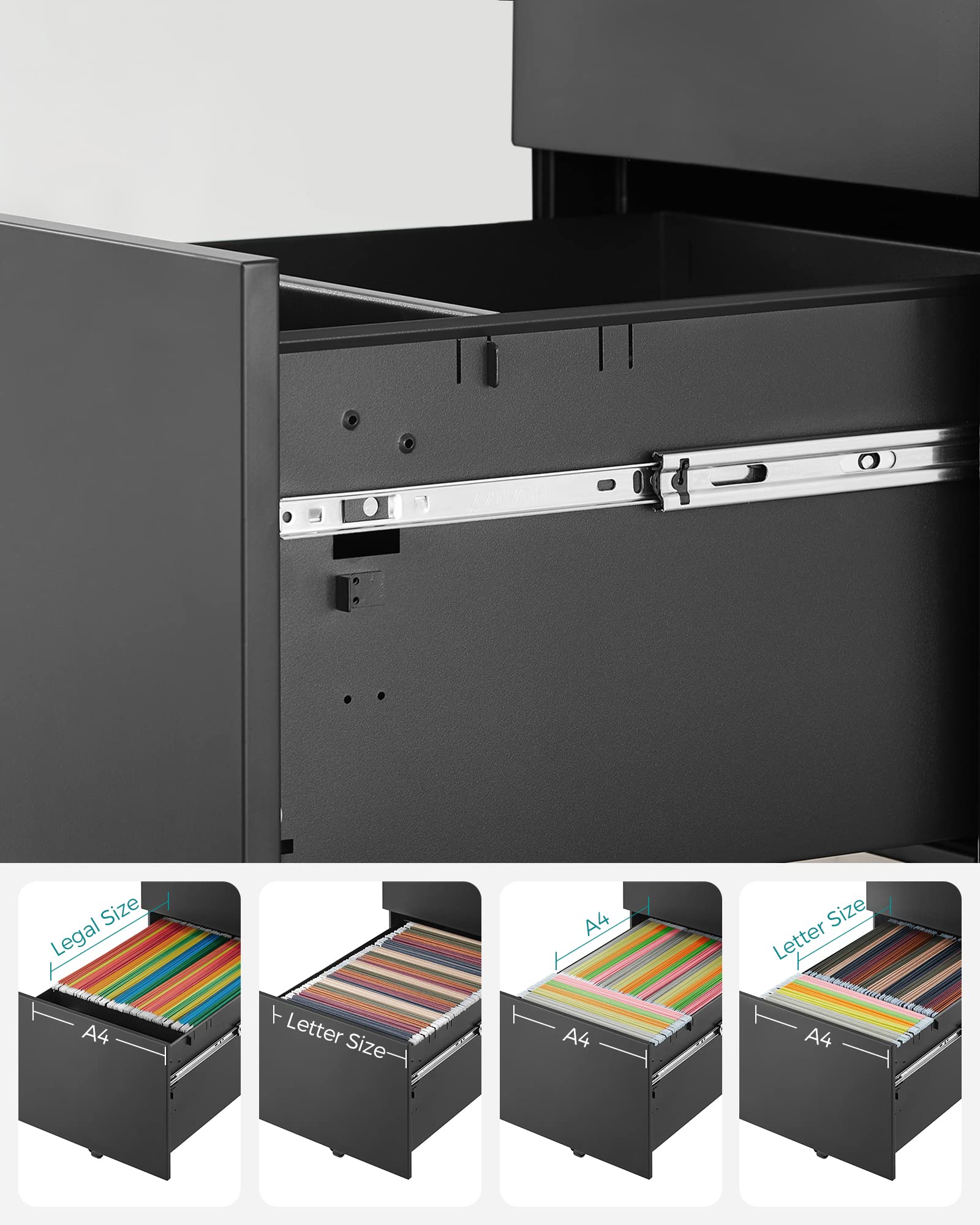 Der Büroschrank ist sehr flexibel. Die Schubladen sind so konzipiert, dass Sie Hängeregister und Dokumente in den gängigen Formaten A4, Letter sowie Legal problemlos und ordentlich unterbringen können.