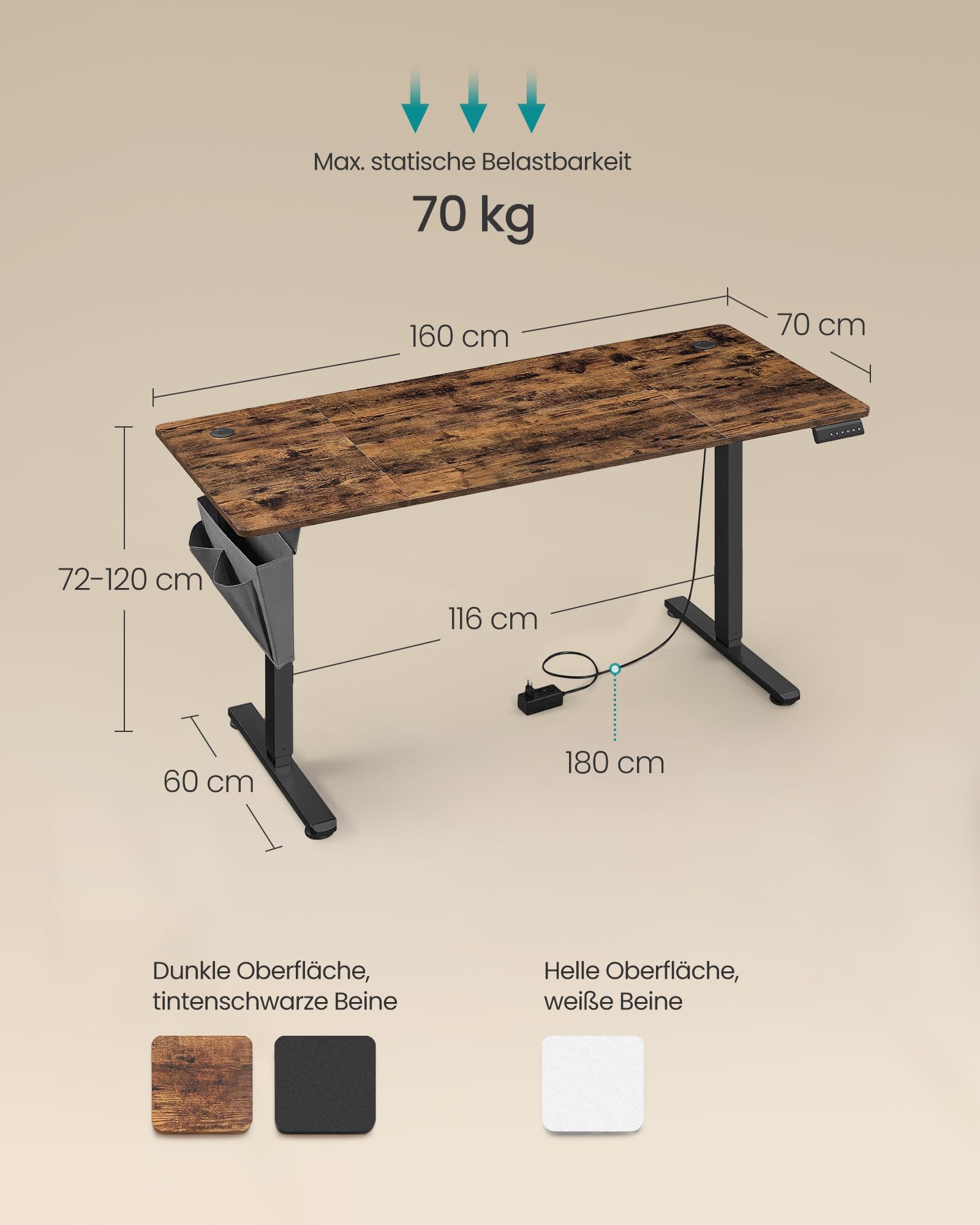 - Stabile Konstruktion: Der robuste Stahlrahmen und der Qualitätsmotor gewährleisten eine sanfte und gleichmässige Verstellung bei einer Belastung von bis zu 70 kg.