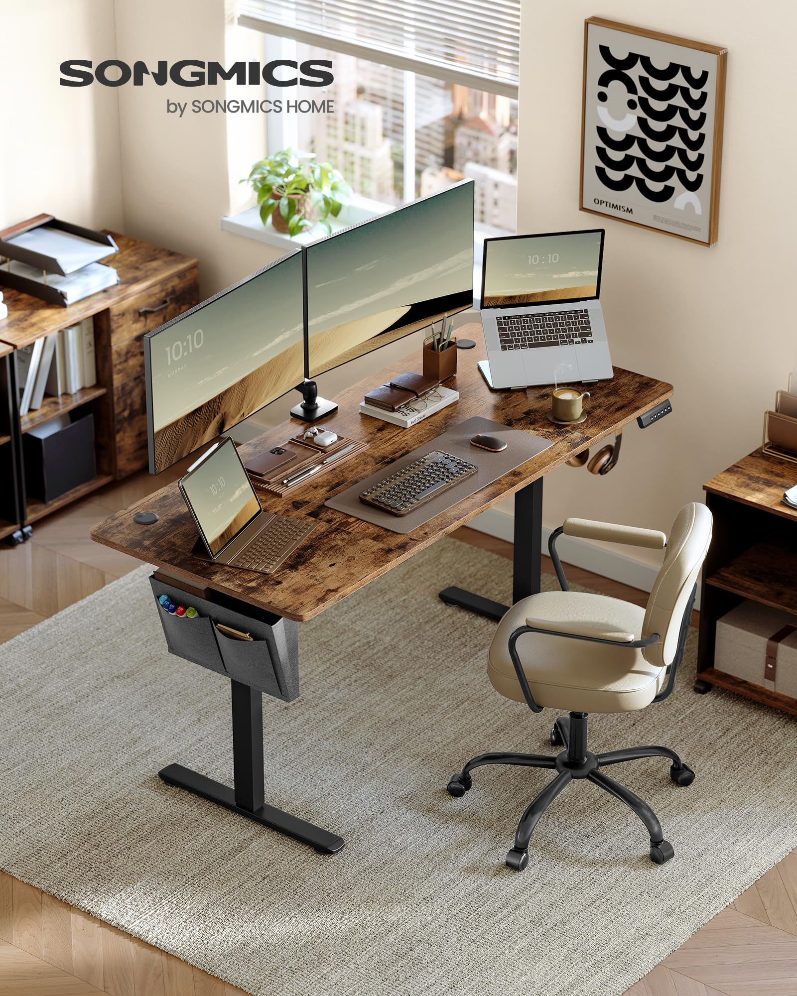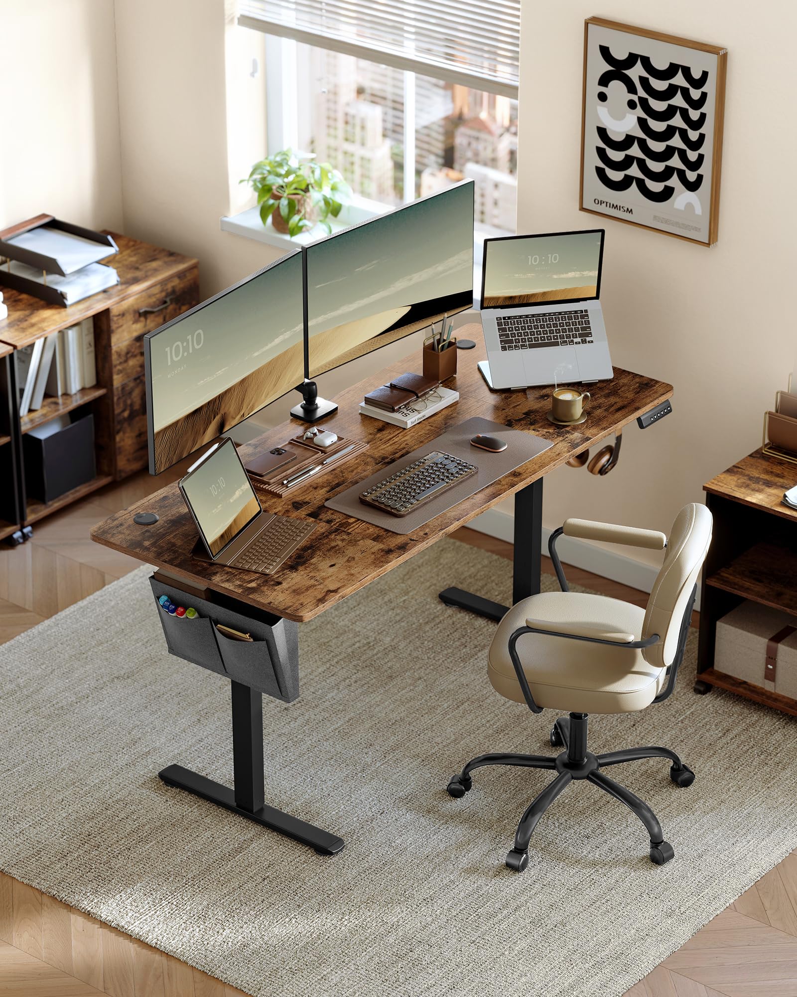 Der Schreibtisch verfügt über einen robusten Stahlrahmen und einen Qualitätsmotor, die für eine hohe Stabilität und eine sanfte Verstellung sorgen. Er kann gleichmässig mit bis zu 70 kg belastet werden, sodass Sie problemlos mehrere Monitore und Ihre gesamte Ausrüstung darauf platzieren können.