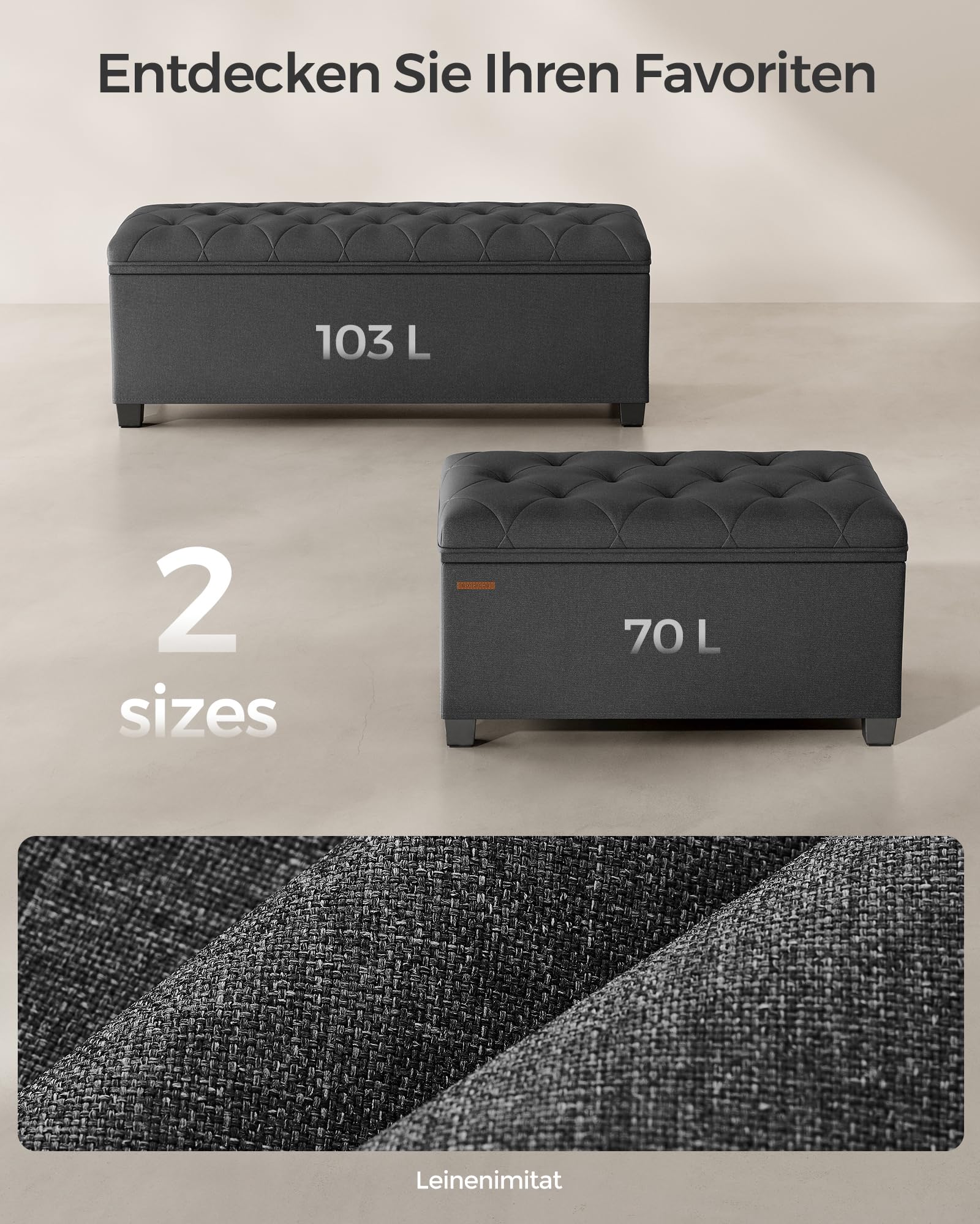 - Elegantes Design: Ansprechende Oberfläche in Leinenoptik mit einer dekorativen Steppung auf dem Deckel.