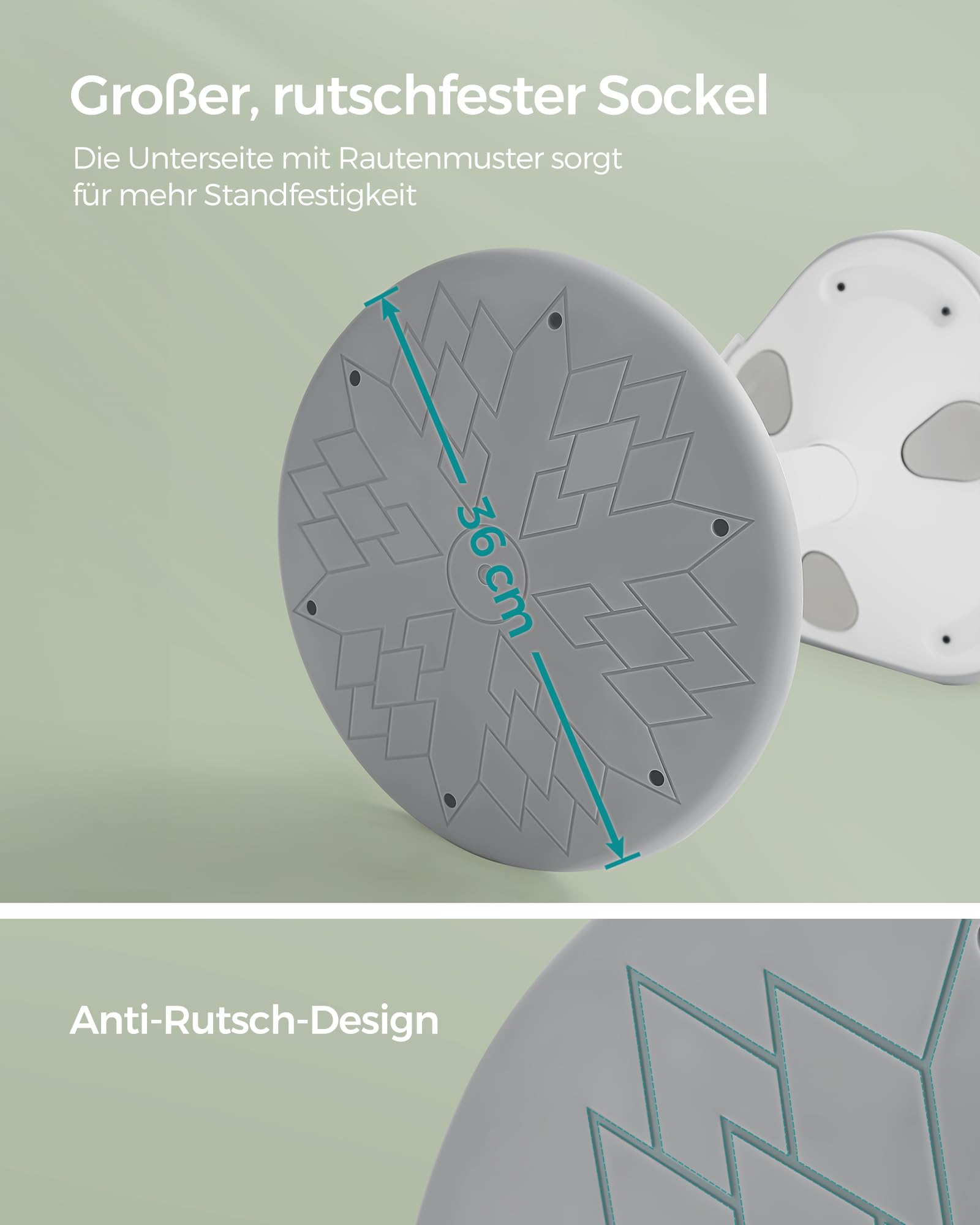 - Grosser, runder Sockel mit Anti-Rutsch-Beschichtung für einen sicheren und stabilen Stand.