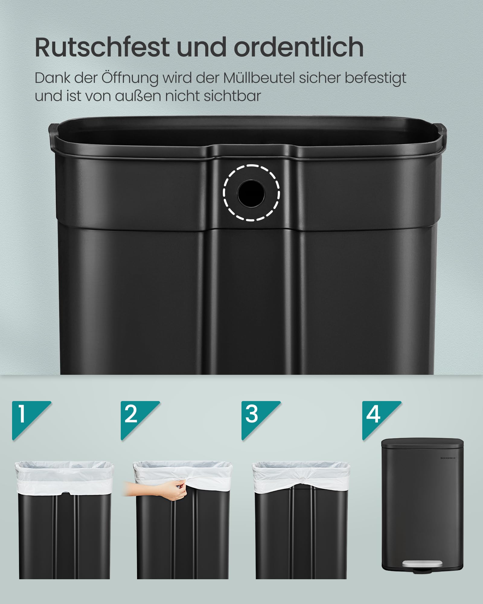 Dieser elegante Treteimer von SONGMICS kombiniert ein grosszügiges Fassungsvermögen von 50 Litern mit einem schlanken, modernen Design. Er ist die ideale und stilvolle Lösung für die Abfallentsorgung in jeder Küche oder jedem grösseren Haushalt.