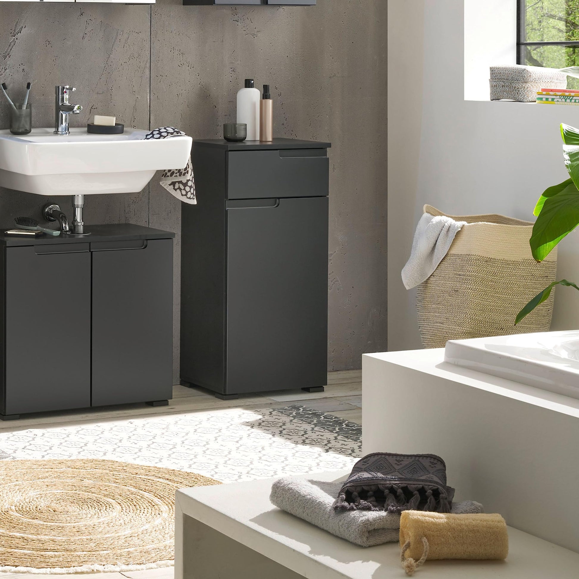 Die klare Linienführung und die mattschwarze Optik schaffen eine moderne und zugleich beruhigende Atmosphäre in Ihrem Bad. Die clever integrierten, ausgesparten Griffmulden unterstreichen das minimalistische Design und sorgen für eine glatte, aufgeräumte Front. Dank dieser schlichten Eleganz lässt sich die Kommode mühelos in verschiedenste Badezimmereinrichtungen integrieren.