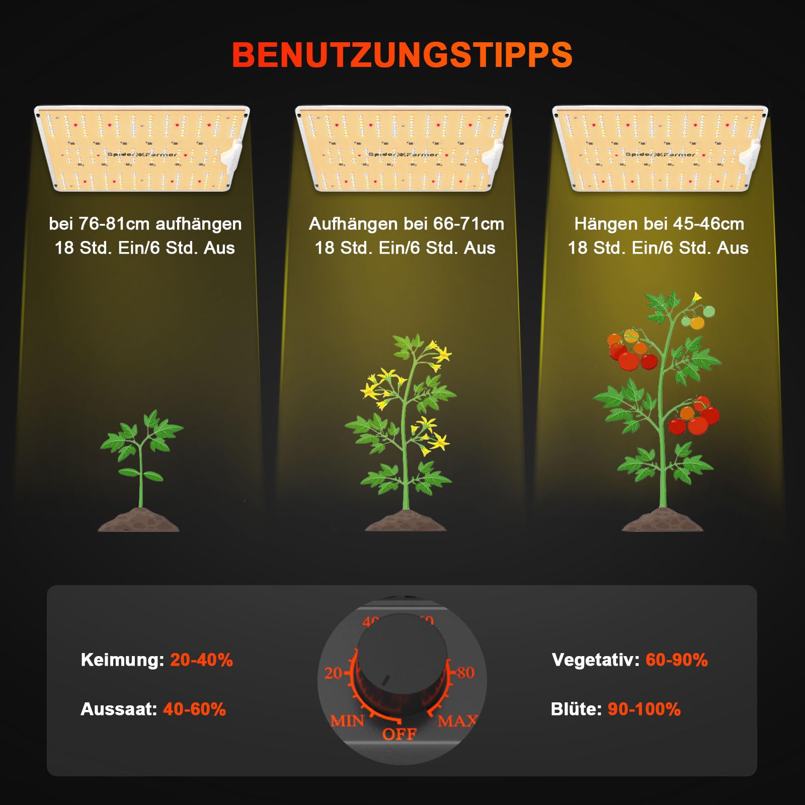 - Optimiertes Vollspektrum: Eine Mischung aus weissem, blauem, rotem und Infrarotlicht (3000K, 5000K, 660nm, 760nm) ahmt das Sonnenlicht nach und fördert ein gesundes Wachstum von der Keimung bis zur Ernte.