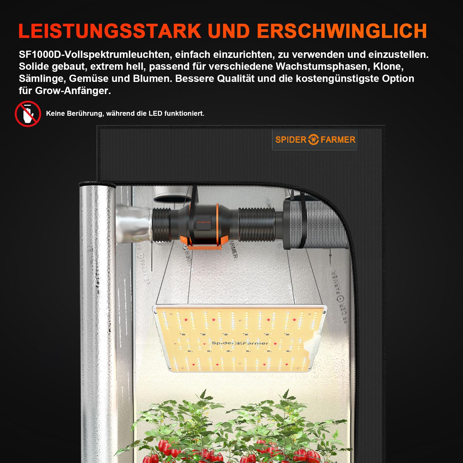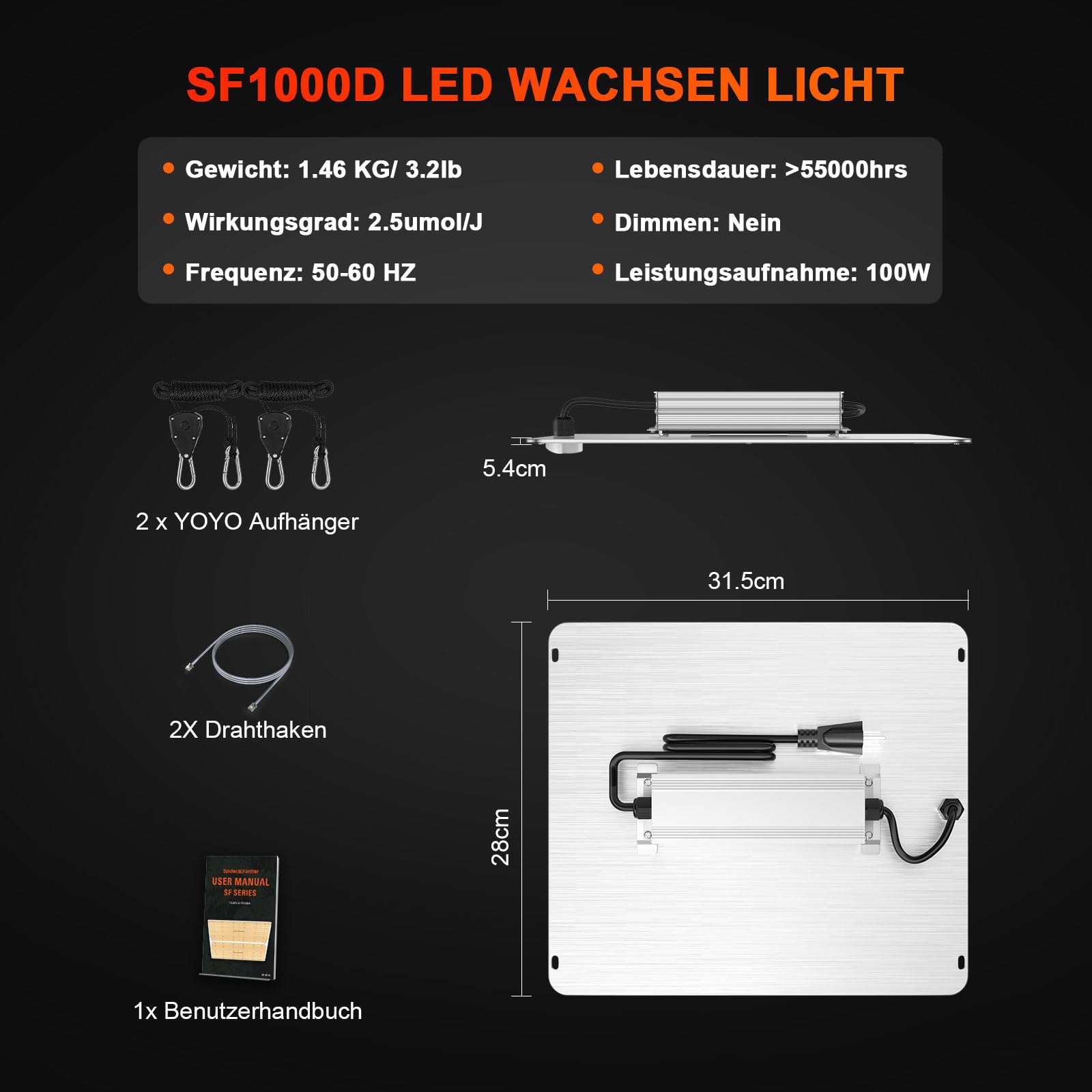 Mit der SF1000D erhalten Sie eine professionelle und benutzerfreundliche Beleuchtungslösung, die Ihre Pflanzen vom Samen bis zur Ernte begleitet.