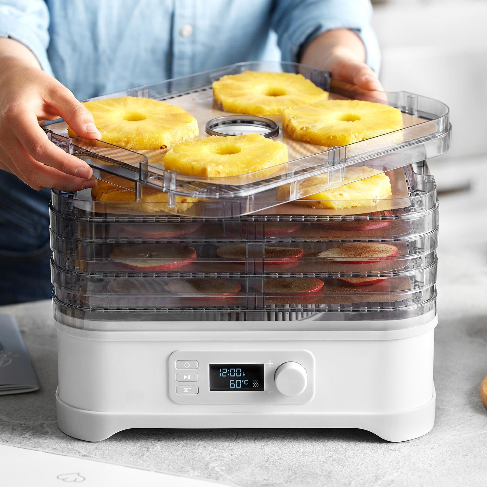 - Flexible Anwendung: Fünf höhenverstellbare und BPA-freie Dörrebenen bieten Platz für Leckereien in diversen Grössen und Mengen.