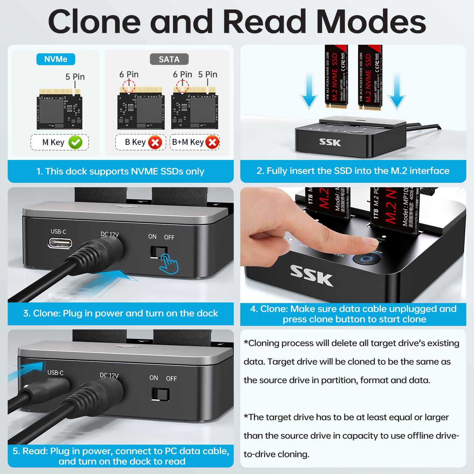 - Kompatibilität: Dieses Gerät unterstützt ausschliesslich NVMe M.2 SSDs. SATA M.2 oder andere SSD-Typen sind nicht kompatibel. Dies gilt sowohl für den normalen Betrieb als auch für die Klonfunktion.