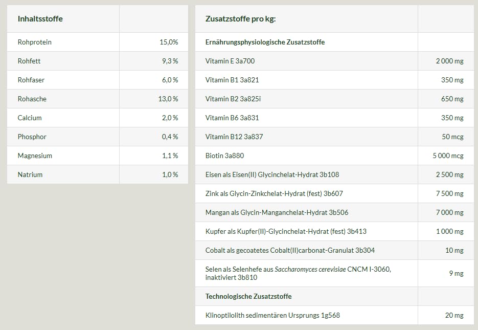 Karotten, Bierhefe, Maiskeime, Leinsamen fein gemahlen, Erbsenprotein, Seealgenmehl, Lein-/ Sonnenblumenöl kaltgepresst, Apfelsirup, Seesalz, Magnesiumfumarat, Knoblauch, Kräuter (Anis, Fenchel), Trauben.
