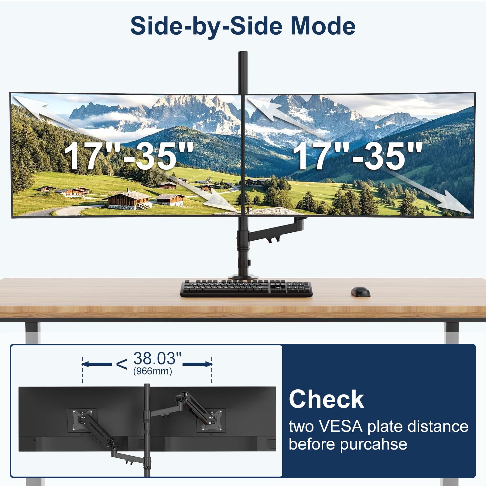 Wichtiger Hinweis zur Grösse: Bei einer nebeneinander liegenden Anordnung von zwei Monitoren stellen Sie bitte sicher, dass die maximale Spannweite der Arme (86 bis 96 cm zwischen den VESA-Platten) für die kombinierte Breite beider Bildschirme ausreicht. Diese Konfiguration ist in der Regel für Monitore bis zu 35 Zoll optimal geeignet.