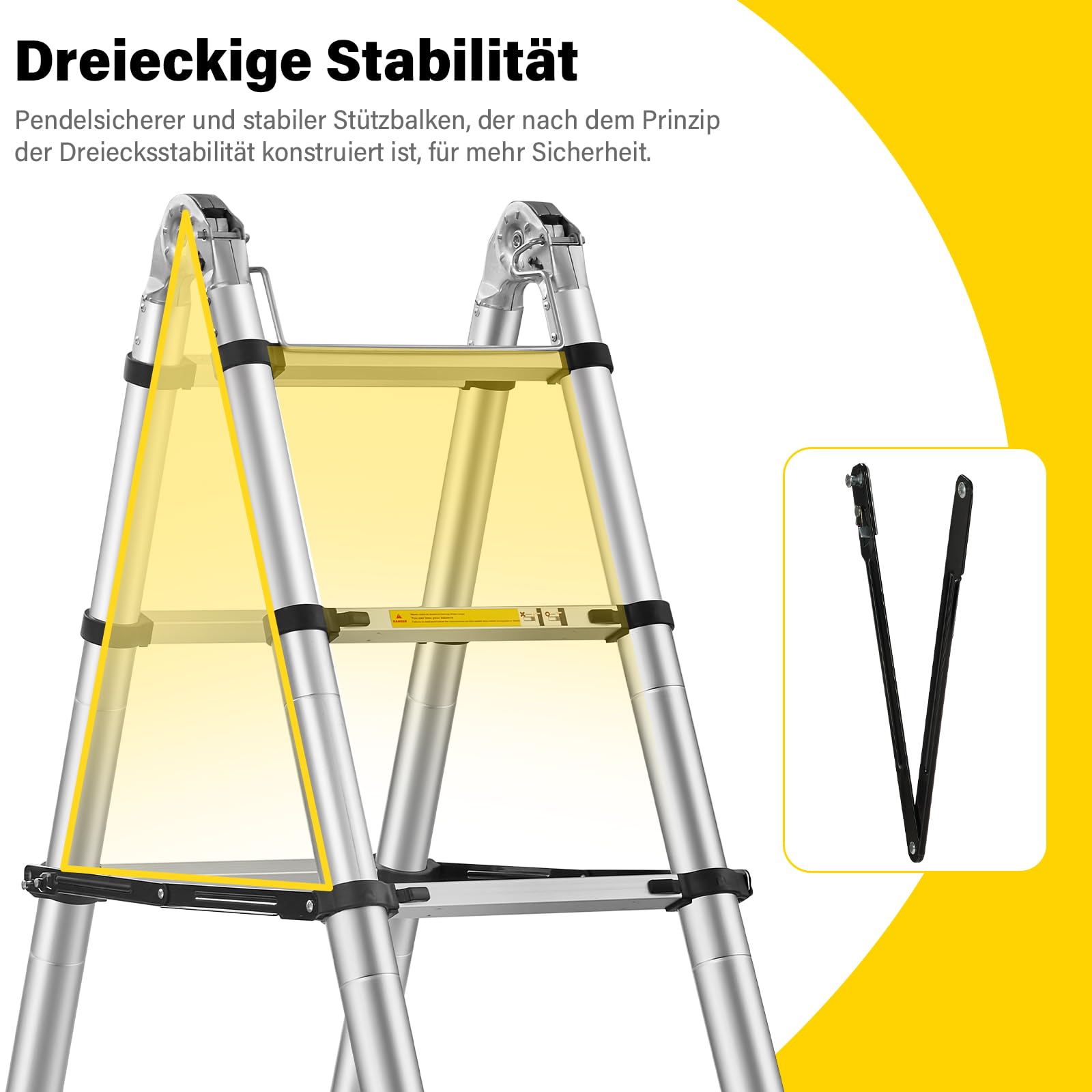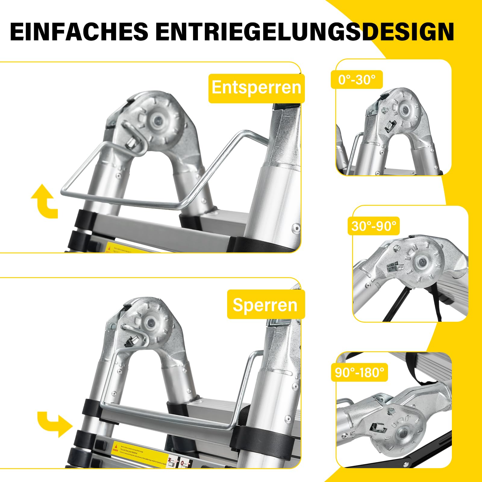 - Vielseitige 2-in-1-Funktion: Die Leiter ist flexibel als A-förmige Stehleiter oder als voll ausgezogene Anlegeleiter nutzbar. Damit ist sie das perfekte Werkzeug für Reparaturen im Haus, Malerarbeiten, Dachreparaturen oder die Fensterreinigung.
