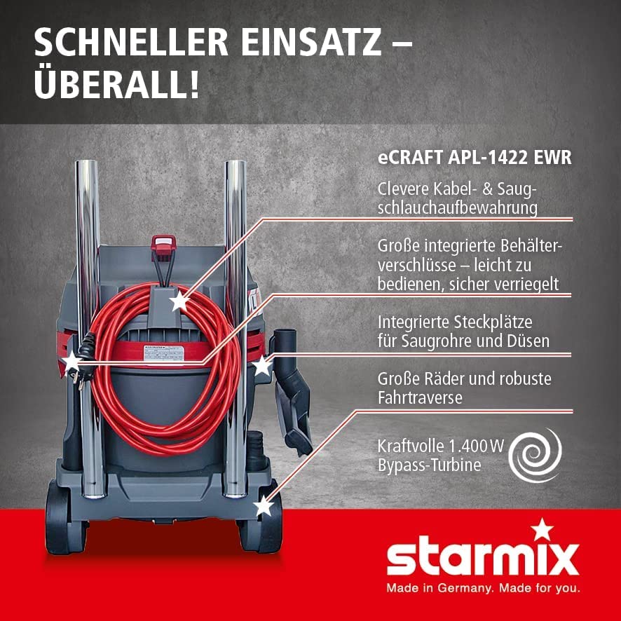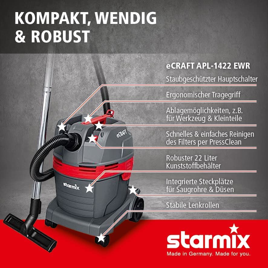 Der Starmix eCraft PL 1422 EWR präsentiert sich als leistungsstarker und vielseitiger Reinigungs-Staubsauger. Er ist der ideale Partner für schnelle und gründliche Sauberkeit in Ihrem Zuhause, dem Hobbykeller oder der Werkstatt.