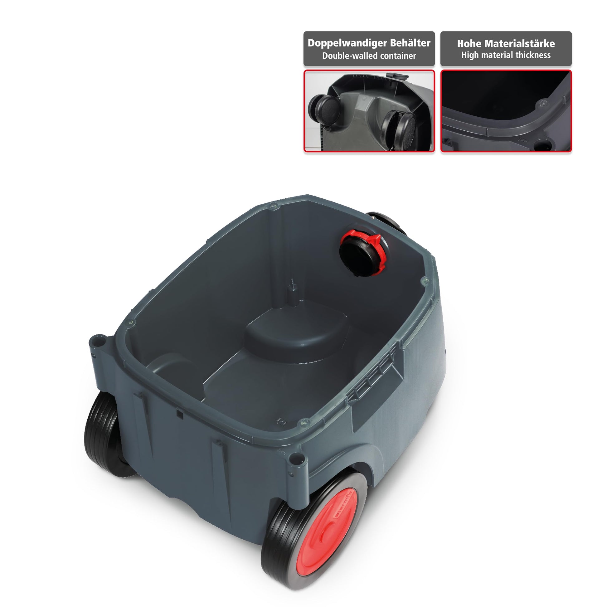 Der Sauger verfügt über einen extrem robusten, doppelwandigen Behälter, der auch starken Belastungen und sogar einem Sturz aus geringer Höhe standhält. Der leistungsstarke Motor erzeugt einen enormen Unterdruck und einen hohen Luftstrom, ideal für das mühelose Aufsaugen von schweren Partikeln oder Flüssigkeiten.