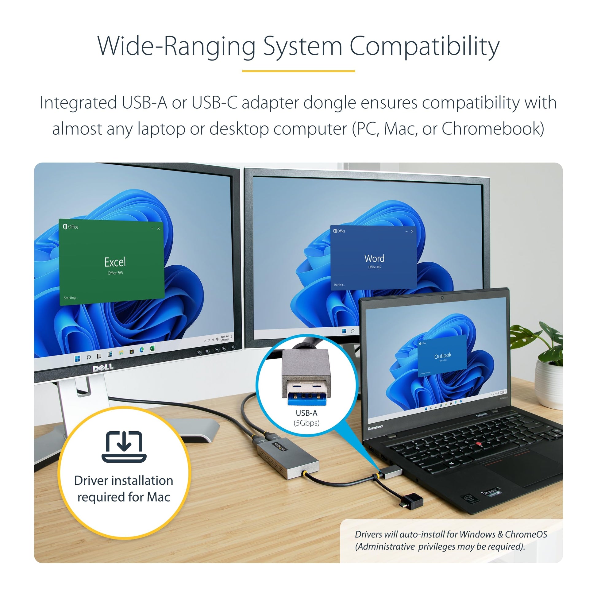 Der Anschluss ist sehr einfach. Sie verbinden den Adapter über das integrierte Kabel mit einem freien USB-A oder USB-C Anschluss Ihres Computers (ein passender Dongle ist im Lieferumfang enthalten). Unter Windows und Chrome OS erfolgt die Treiberinstallation automatisch. Für macOS und Ubuntu ist eine einfache, einmalige Treiberinstallation von der StarTech-Website erforderlich, um die volle Funktionalität zu gewährleisten.