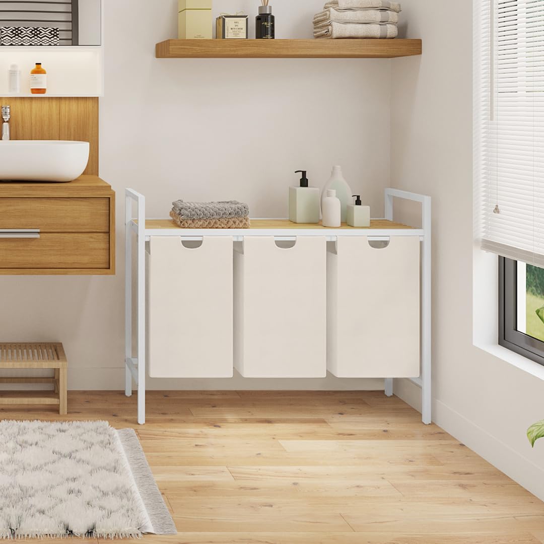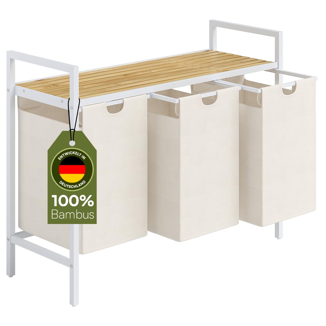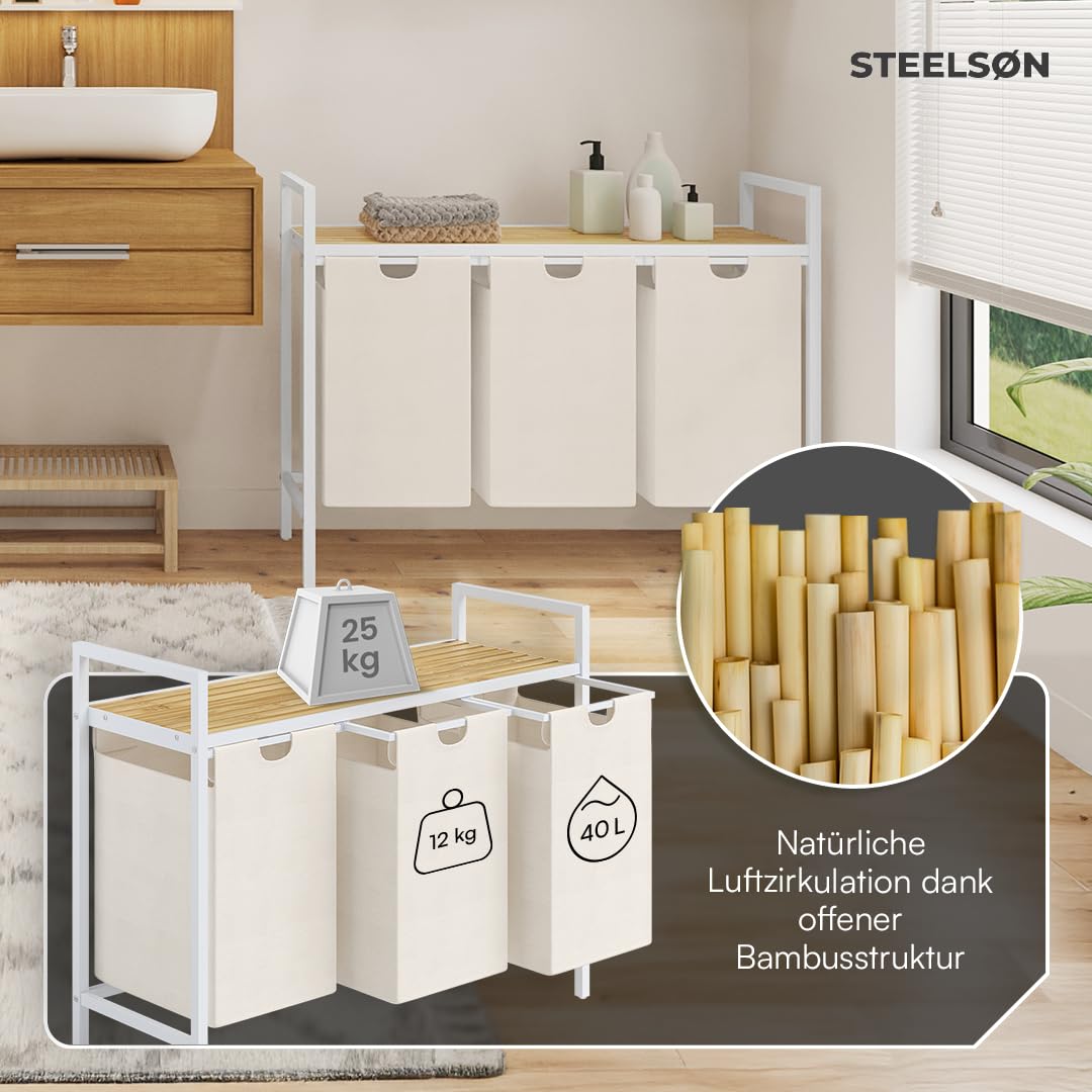 STEELSØN Rigil Wäschesammler – 3-Fach, Bambus Ablage Weiss
