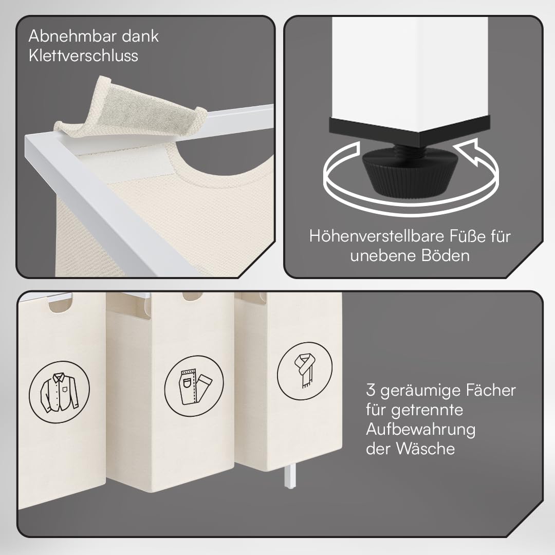 - Systematische Wäschetrennung: Ausgestattet mit drei Fächern zu je 40 Litern für eine mühelose Vorsortierung Ihrer hellen, dunklen und farbigen Wäsche.