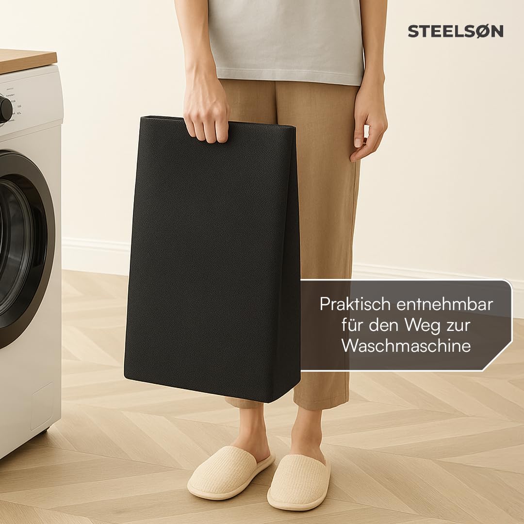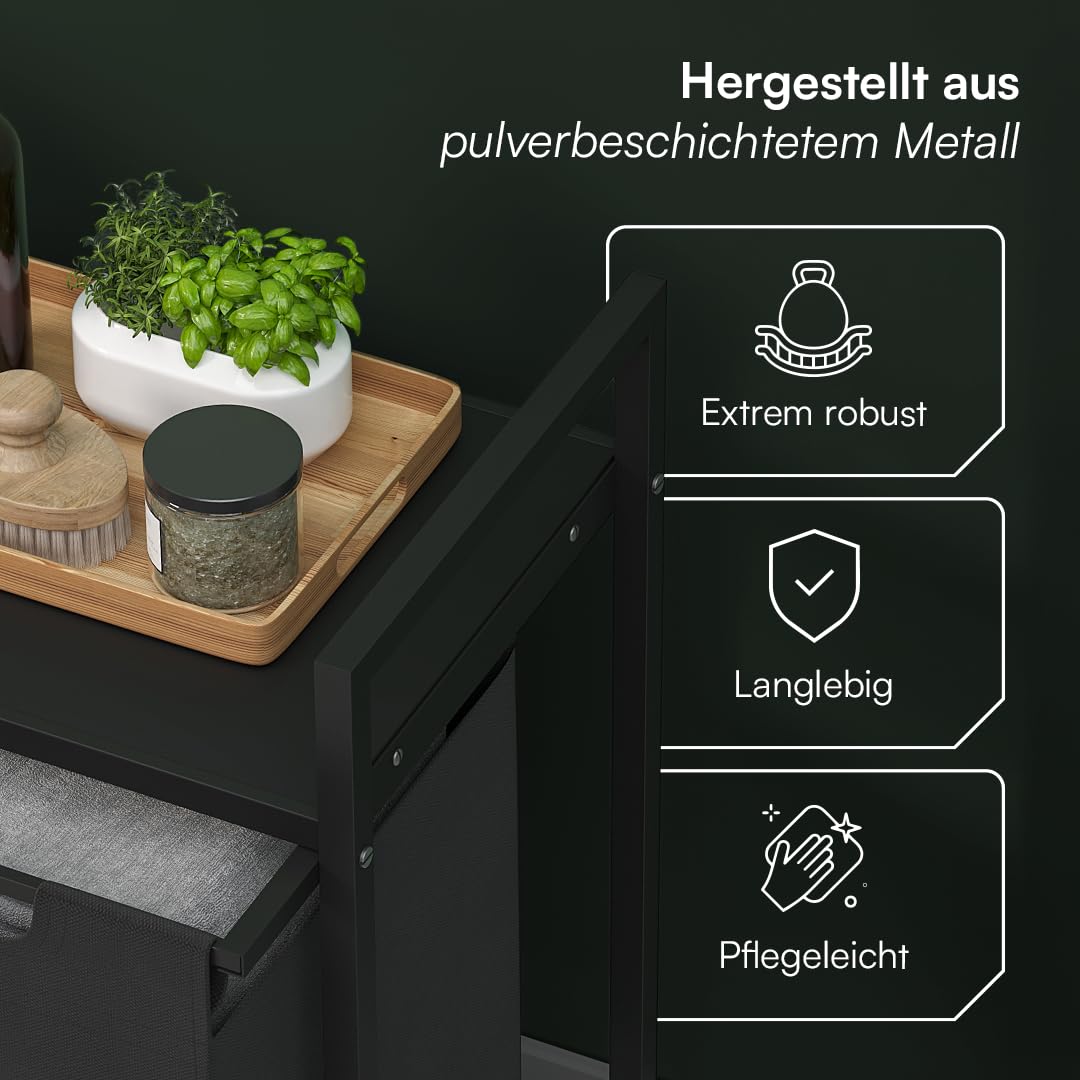 - Elegantes Design: Ein Gestell aus schwarzem Metall, kombiniert mit einer oberen Ablagefläche, macht den Wäschesammler zu einem modernen Möbelstück für Bad, Schlafzimmer oder Waschküche.